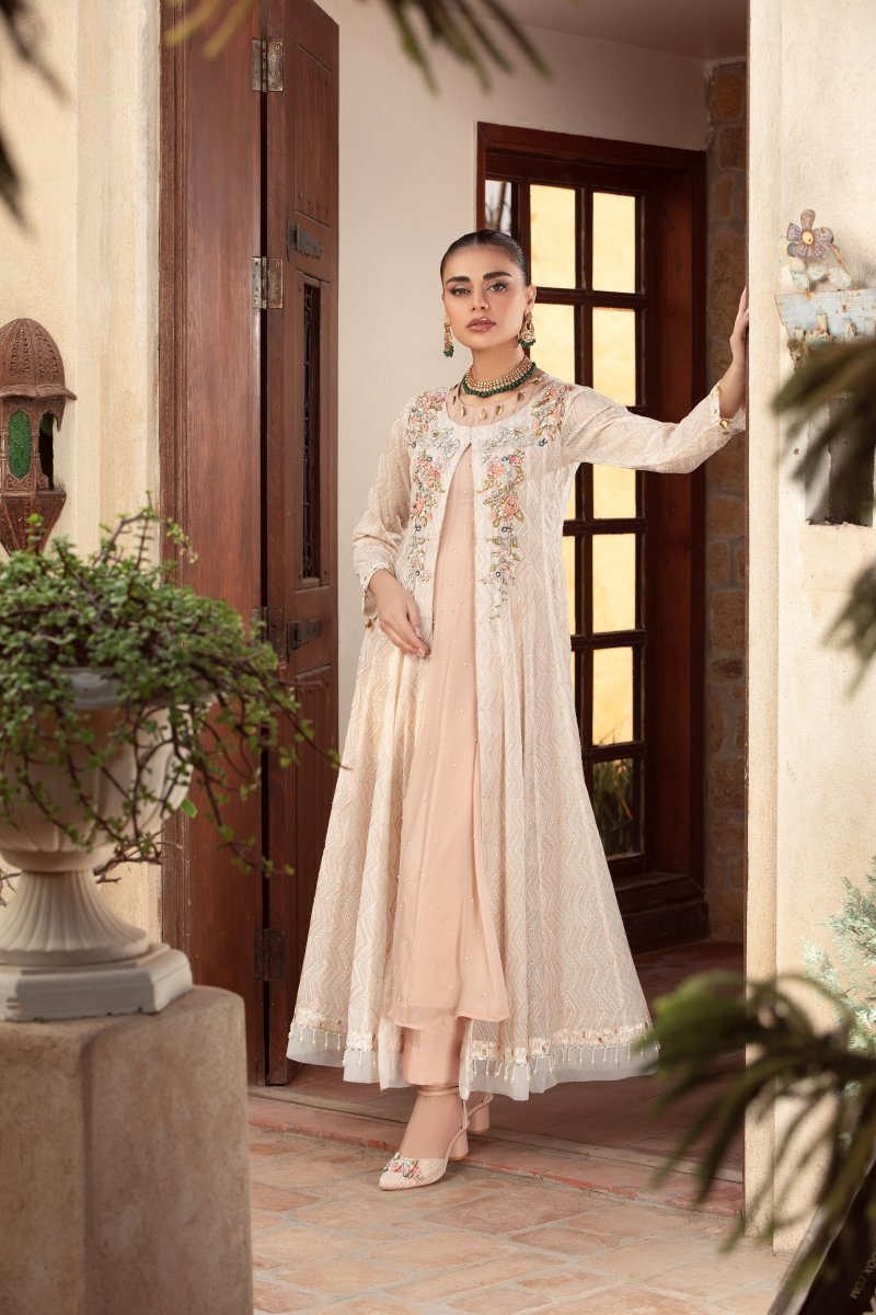 A stunning ivory & peach dress that comes with a stylish gown This article features gorgeous handwork and embellishments on the neckline. It€™s topped off with laces on the sleeves & damann.