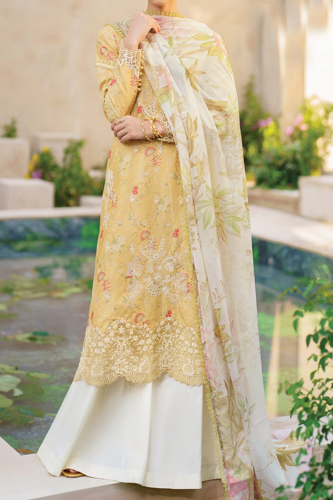 Shirt Front: Borer Embroidered Printed LawnShirt Back & Sleeves: Printed Lawn Front Lace: Embroidered Organza (0.85 M) Sleeves Lace: Borer Embroidered...
