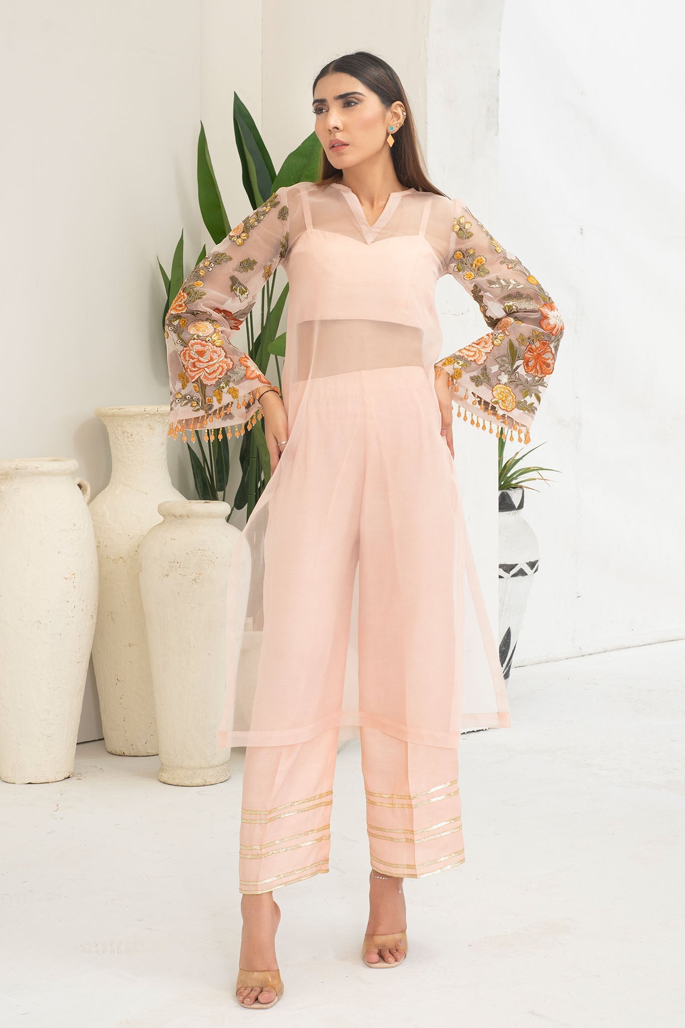 Powder pink shirt with embroidered bell sleeves, paired with raw silk trousers and an organza dupatta, sounds like a dreamy and elegant outfit! The mix of textures and detailing creates a chic and sophisticated look.