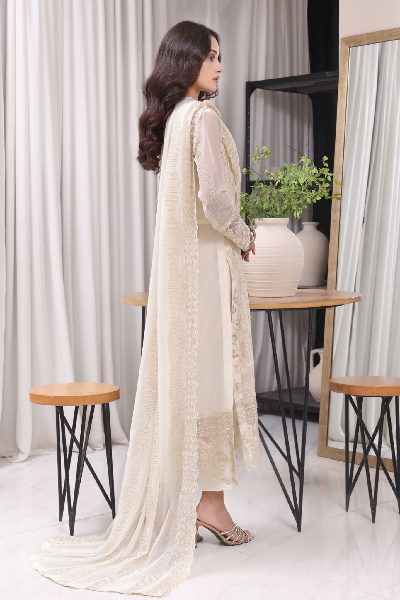 Embroidered Chiffon Front Shirt Plain Chiffon Back Shirt Embroidered Chiffon Sleeves Embroidered Chiffon Dupatta Dyed Raw Silk Trouser