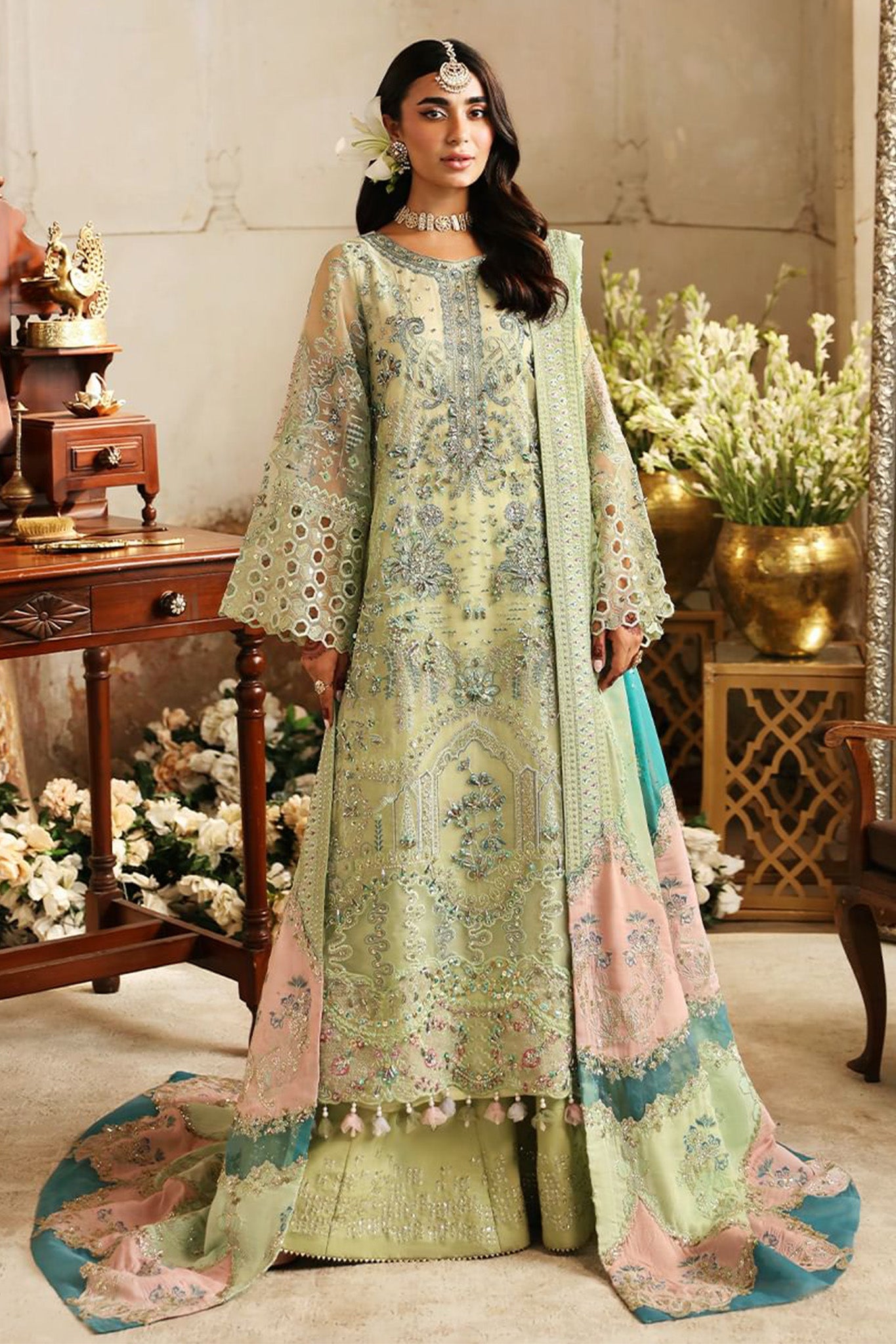 Embroidered organza front with hand embellishment Embroidered organza back Embroidered organza sleeves with hand embellishment Embroidered organza front daman patch...