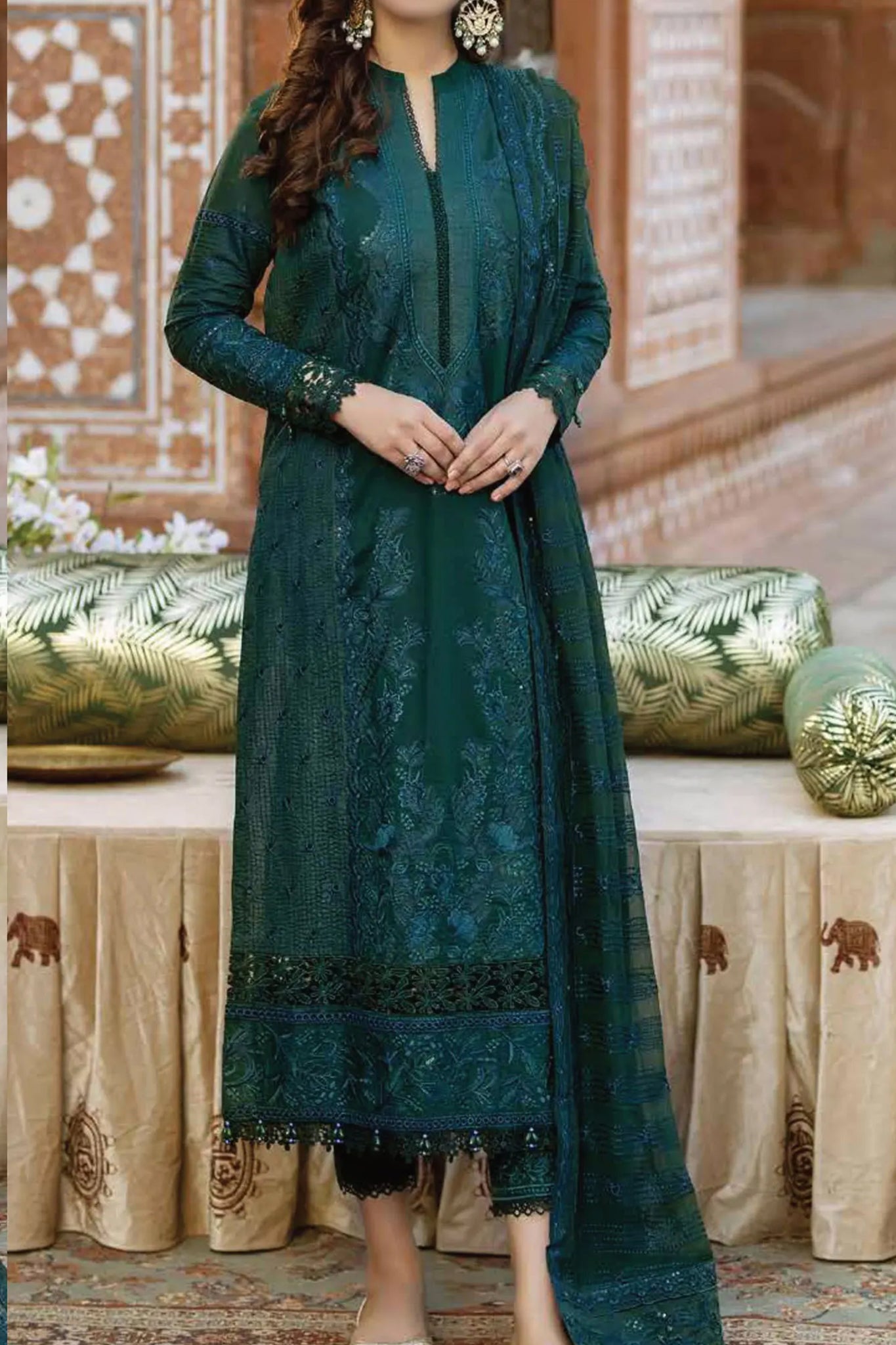 Heavy Embroidered shirt 1.3mtr Embroidered back 1.3 mtr Embroidered sleeves 0.75 mtr Embroidered chiffon dupatta 2.5 mtr Plain trouser 2.5...