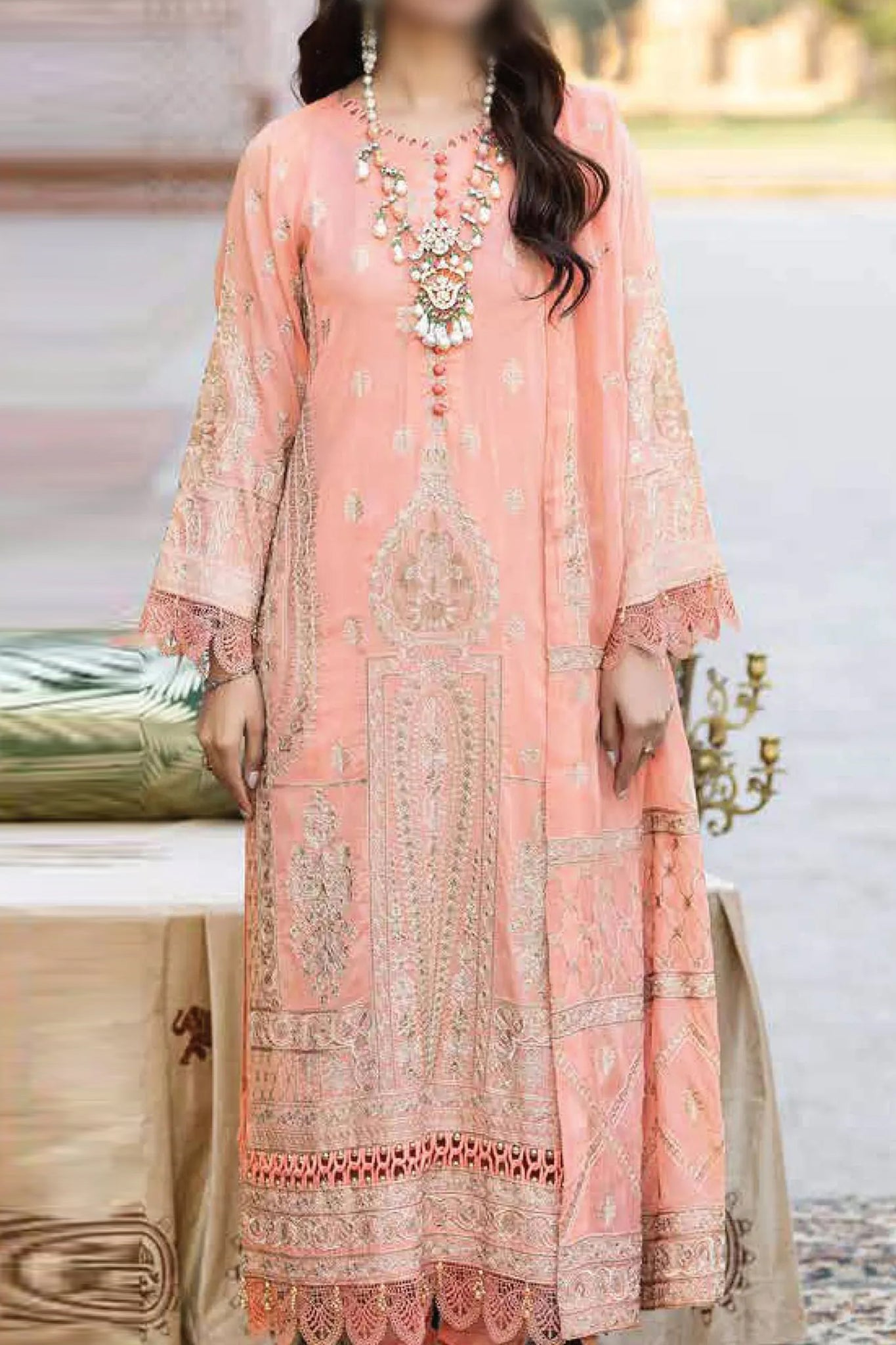 Heavy Embroidered shirt 1.3mtr Embroidered back 1.3 mtr Embroidered sleeves 0.75 mtr Embroidered chiffon dupatta 2.5 mtr Plain trouser 2.5...