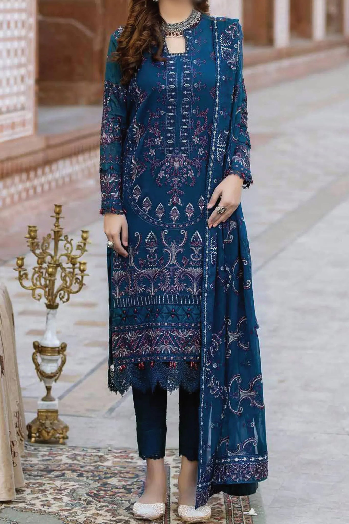 Heavy Embroidered shirt 1.3mtr Embroidered back 1.3 mtr Embroidered sleeves 0.75 mtr Embroidered chiffon dupatta 2.5 mtr Plain trouser 2.5...