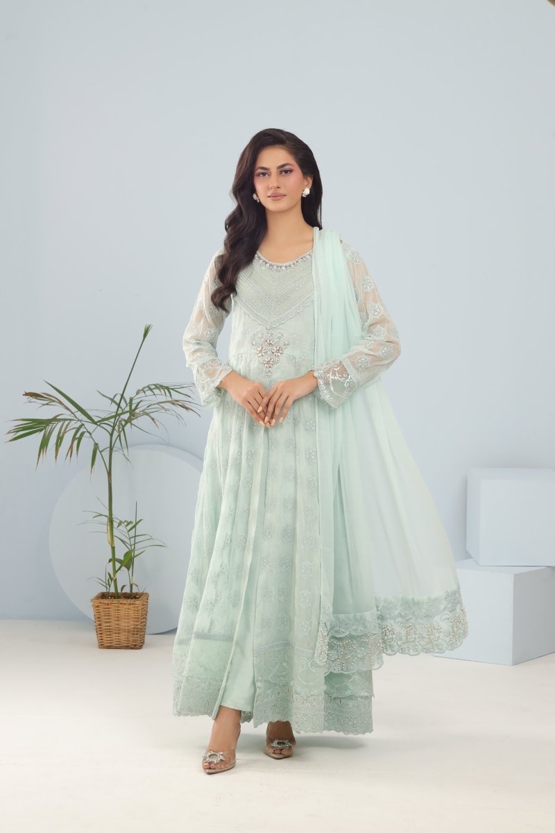 A stylish chiffon frock in a refreshing ice blue hue - It makes a perfect outfit with its intricately designed neckline, done up with beautiful handwork & embellishments, a fully embroidered fabric and graceful ;ace finishing on the sleeves & damann.