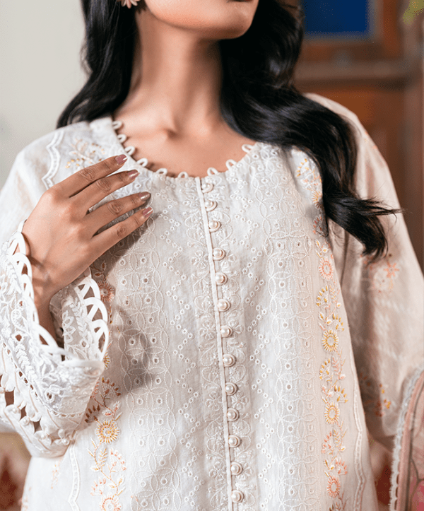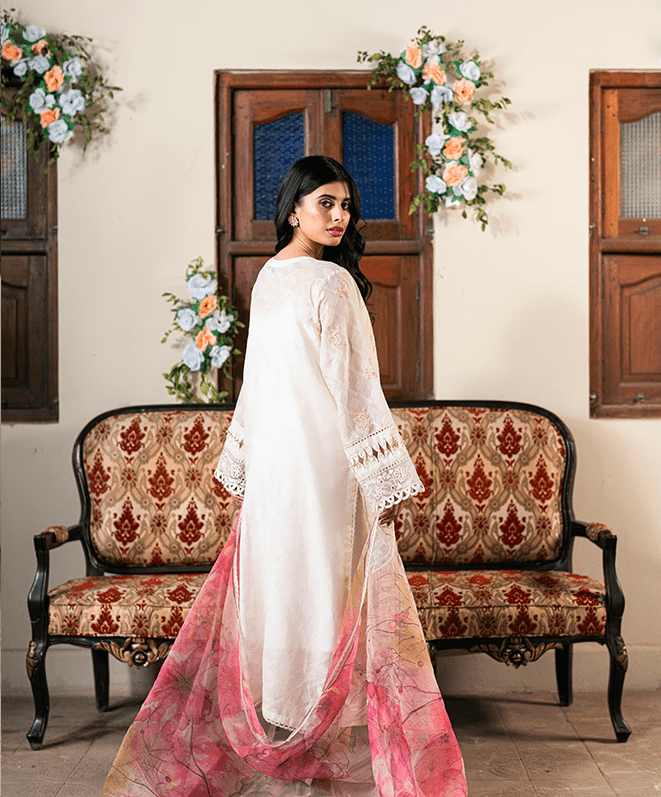 Nargis is a delightful fusion of grace and vibrancy. The floral embroidery on the soft fabric creates an eye-catching contrast, while the matching trousers and a flowing pink dupatta complete the ensemble. A charming pick for any festive occasion.