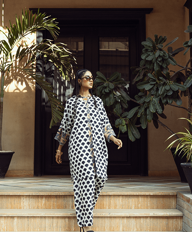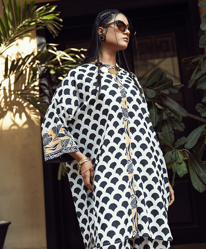 Capture the warmth of Saffron Sunset. This 2-piece set is a prnted black and white ensemble with a bold geometric scallop pattern throughout. The buttons and sleeve edges have subtle golden detailing, adding a touch of contrast and elegance.