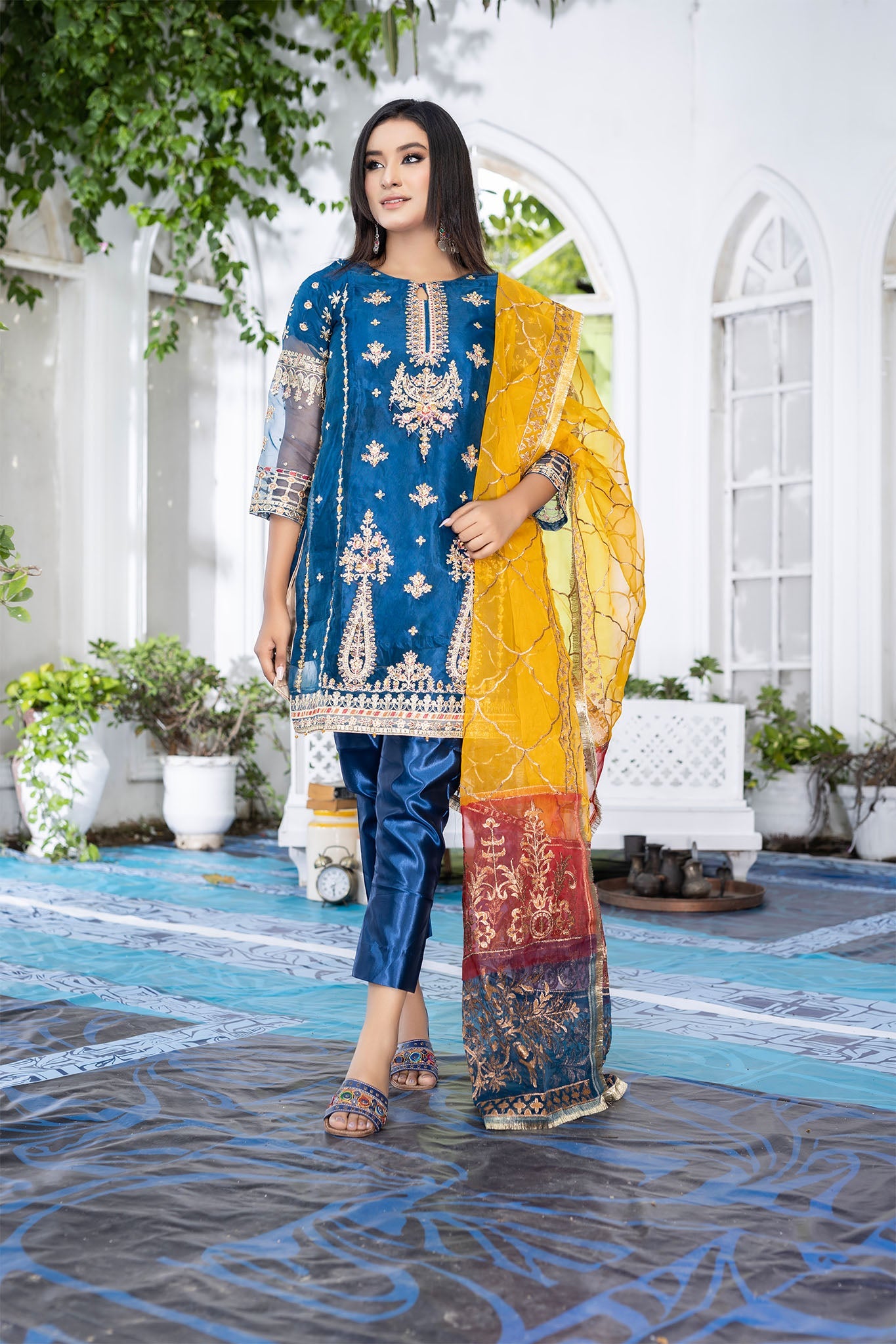 Let’s get your hands on this artistic blue article. This phenomenal ensemble illustrates the beautiful hand embellishments of kora & dabka work. An embroidered organza 3-piece bridal suit is perfect for your big day look. The multi-colored organza dupatta and plain gripped trouser style exude grace. Moreover, if we look deeper into the details of this exquisite dress, then it illustrates silk and organza fabric. So, pick it up as it is a perfect option in Pakistani bridal dresses online, and accessorize this striking blue, and vibrant yellow dress, and rock your event as you have always dreamt of!