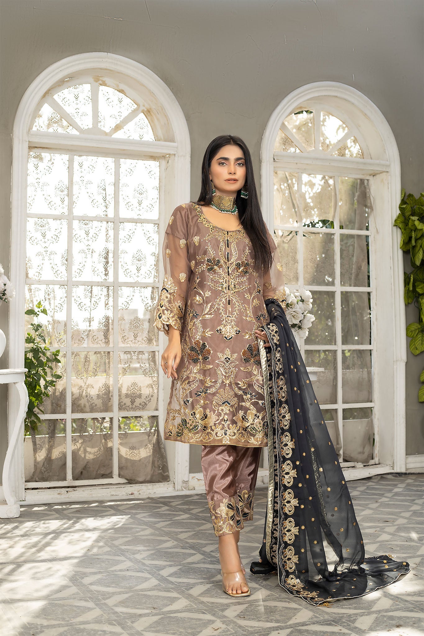 Another striking dress has been introduced by Ketifa, one of the best women’s clothing brands in Pakistan. Let’s have a glance at the exquisite features of this dress. The shirt of this luxury dress in Pakistan has a light brown color. And the phenomenal hand-crafted gotta work over the front side, and sleeves and the trouser is adding the ice to the cake! Whether it’s a formal get to gather or an Eid party, let this fancy women’s dress serves you with the best! If you are looking for a perfect 3-piece stitched suit online in Pakistan, then let’s not think twice, and get your hands on this Pakistani readymade dress.Embroidered Sequins Organza Front with Heavy Hand Embellishment Kora, Dabka work with Patch