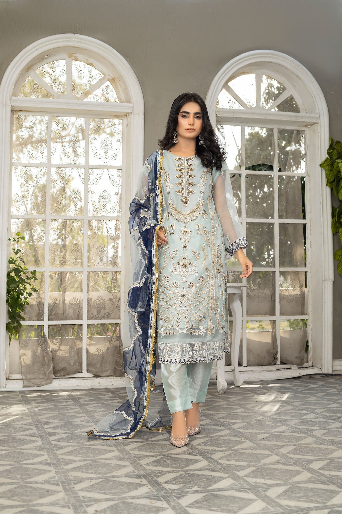 Get your hands on the evergreen color combination of zen, and silver, and let you make a stand out from the crowd! If you are looking for the best Pakistani chiffon dress, then pick this dress from Ketifa, one of the best luxury clothing brands in Pakistan. Let’s see the details of this pretty woman 3 piece suit. It illustrates heavy embroidery on the front, with hand-crafted embellishments of gotta, and patchwork. It also illustrates the embroidery organza ghera with the beautiful hand-crafted work. Aside from the shirt, the light zen hue on the dupatta is making the whole dress appealing.
