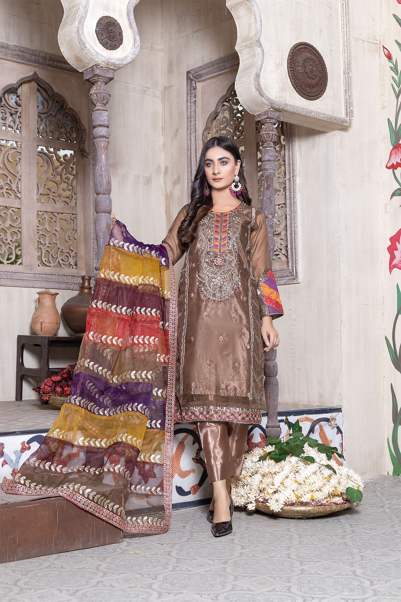 dress is its organza multicolored majestic dupatta. The colors included in this dupatta match the vibe of this Rich Caramel where the same patch is crafted to the sleeves. The delicately elaborated Kora dabka work on the neck of the shirt has orange and purple colors to it. The plain trouser of this dress in the same color flawlessly matches the look of this beautiful dress. The back side of the shirt is done with thread work which makes it an elegant choice for wedding dresses in Pakistan.