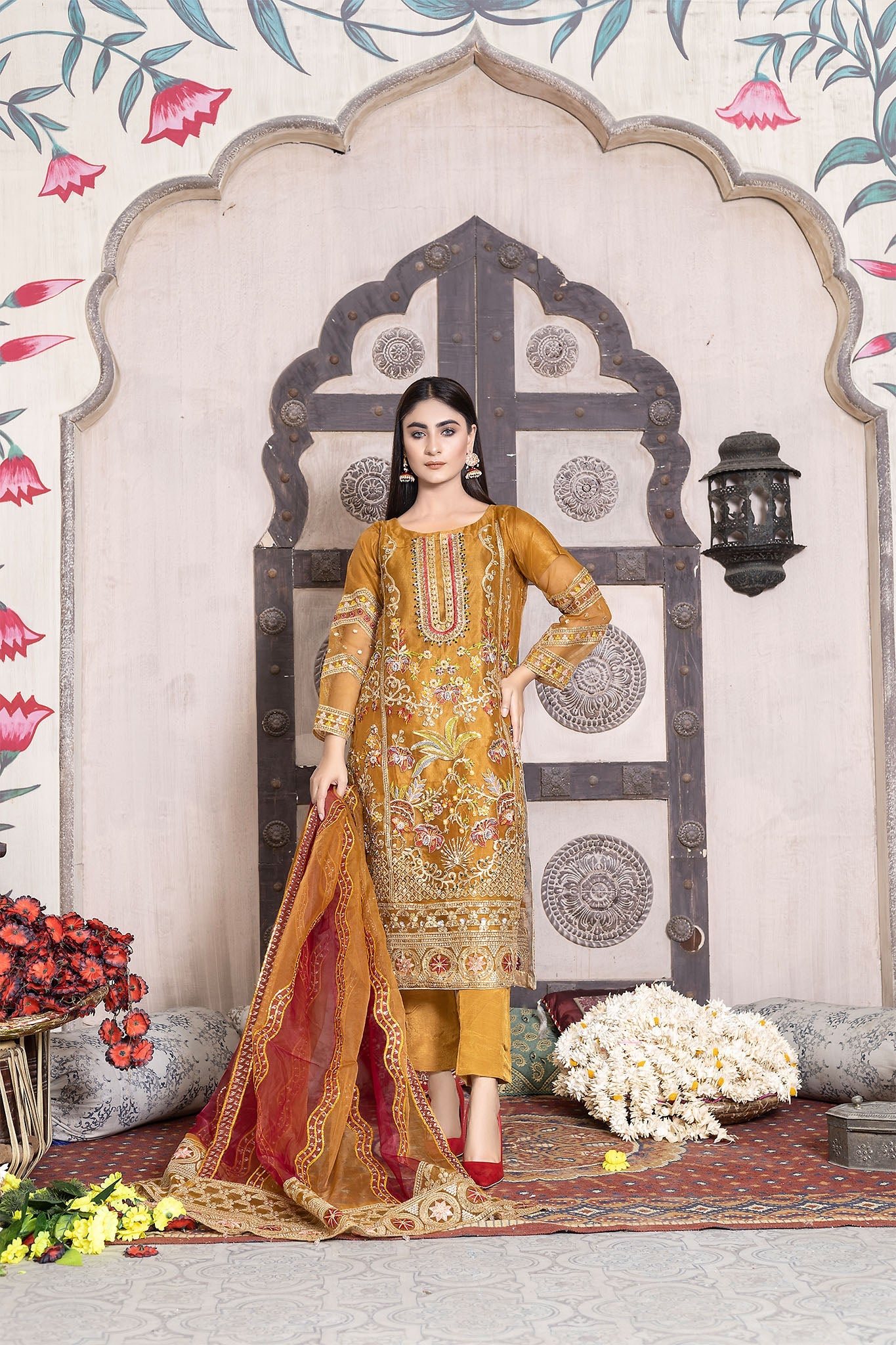 definitely make you the evening star. The back side of these designer dresses is also covered with the finest hand embellishment to enhance their appearance. Moreover, the threadwork on these embroidered dresses covering the sleeves, makes the outfit more attractive. Not only that the embroidery patch on the back will make head turns for sure. This golden color lavish outfit comes with an organza embroidered dupatta and plain grip trousers.