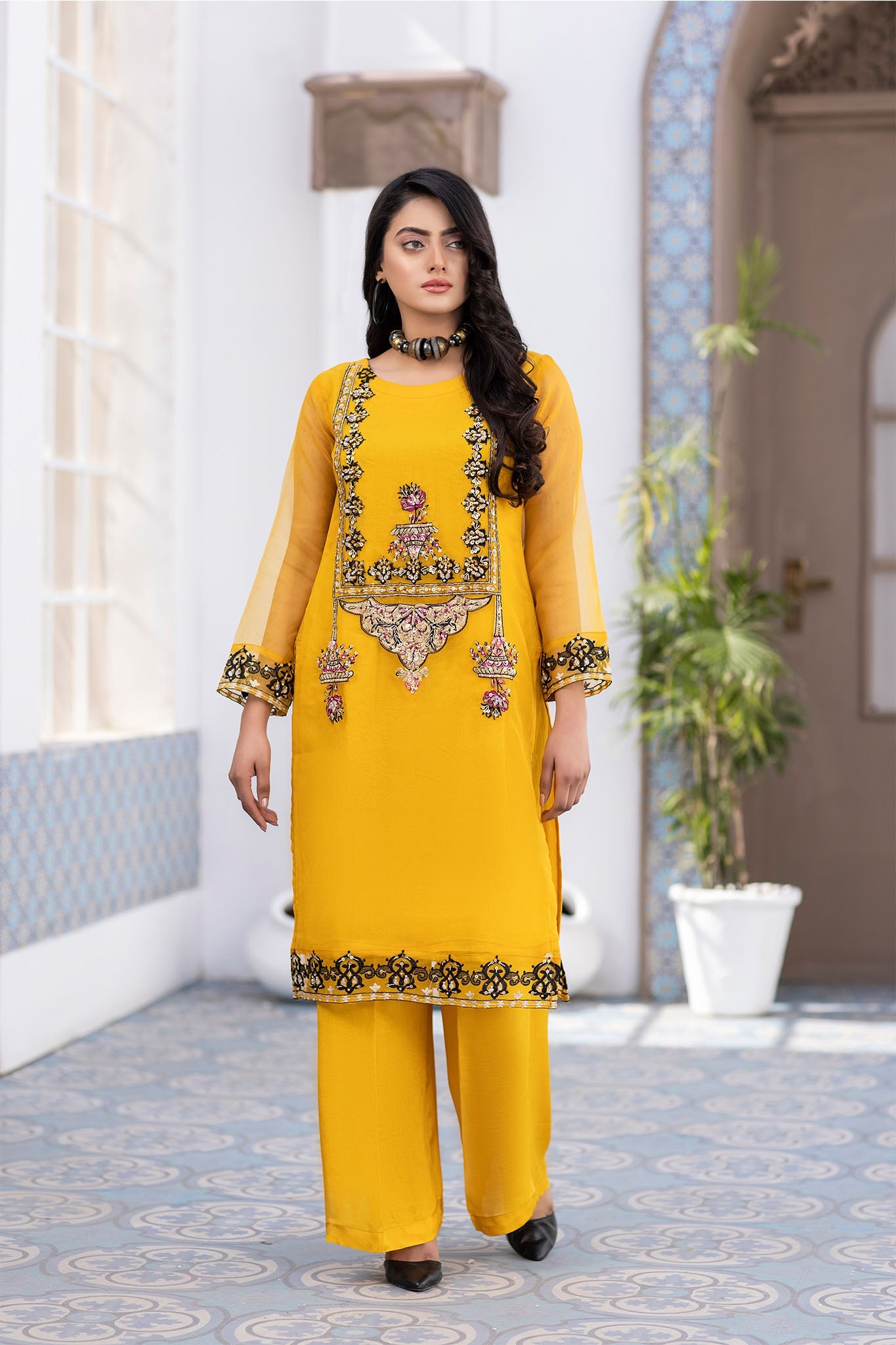 Looking to wear something colorful yet classy during this wedding season? This mustard-colored organza attire is adorned with black and white handwork. The work covers the front of the neck and daman from both sides. The dress has same-colored trousers which complement the whole look. This Glamorous Gold outfit is all that one could wish to have in their wardrobe.