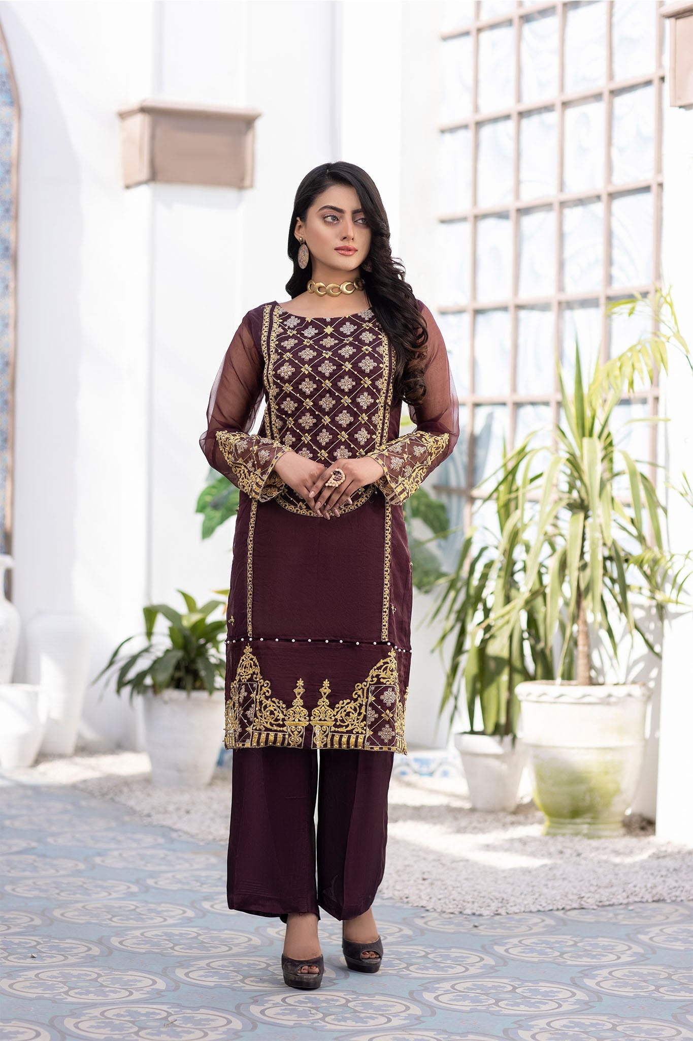 Ketifa ready to wear collection has presented some amazing color palettes in their recent organza series. Such as this Maroon Flame will make you fall in love with the flawlessly detailed handwork of kora and dabka. Classy embroidery work is done on the neck area along with daman. Sleeve corners are also covered with the same dull golden work which produces a glamorous effect on your appearance.
