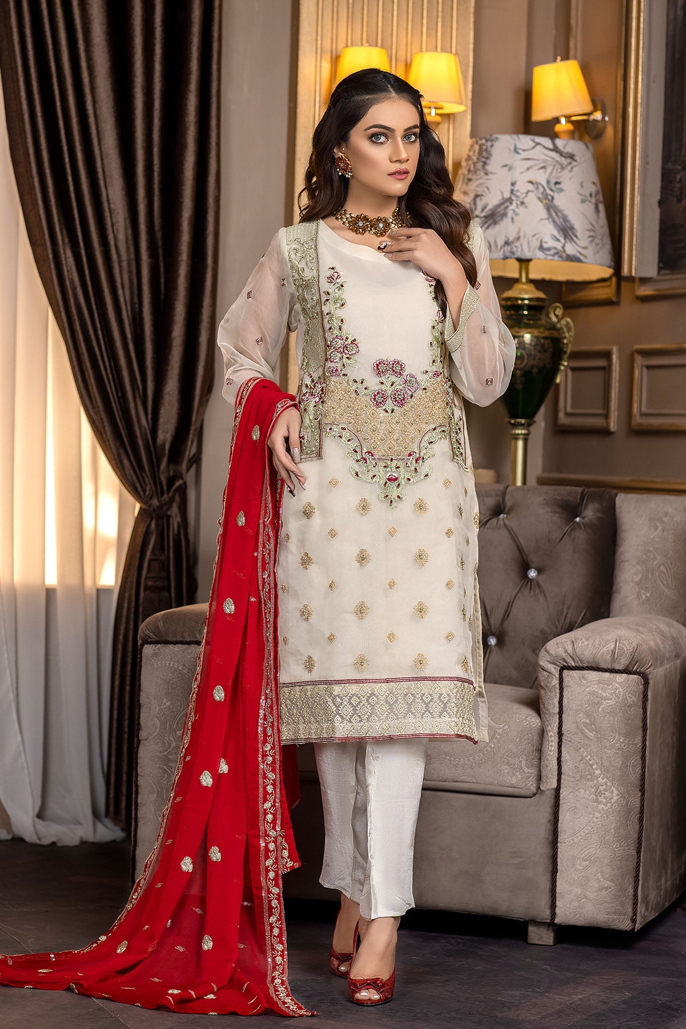 Delicately crafted hand-embroidered organza shirt in pearl white color is the ideal pick for evening events. Embroidery is done with dull gold and a hint of red makes an exquisite front. The border is moderately broad with the same Resham embroidery. Plain back is also available in organza fabric. The chiffon red rose dupatta pours life into this decent pearl white luxury pret wear. The trouser comes in Russian grip fabric in the same white color.