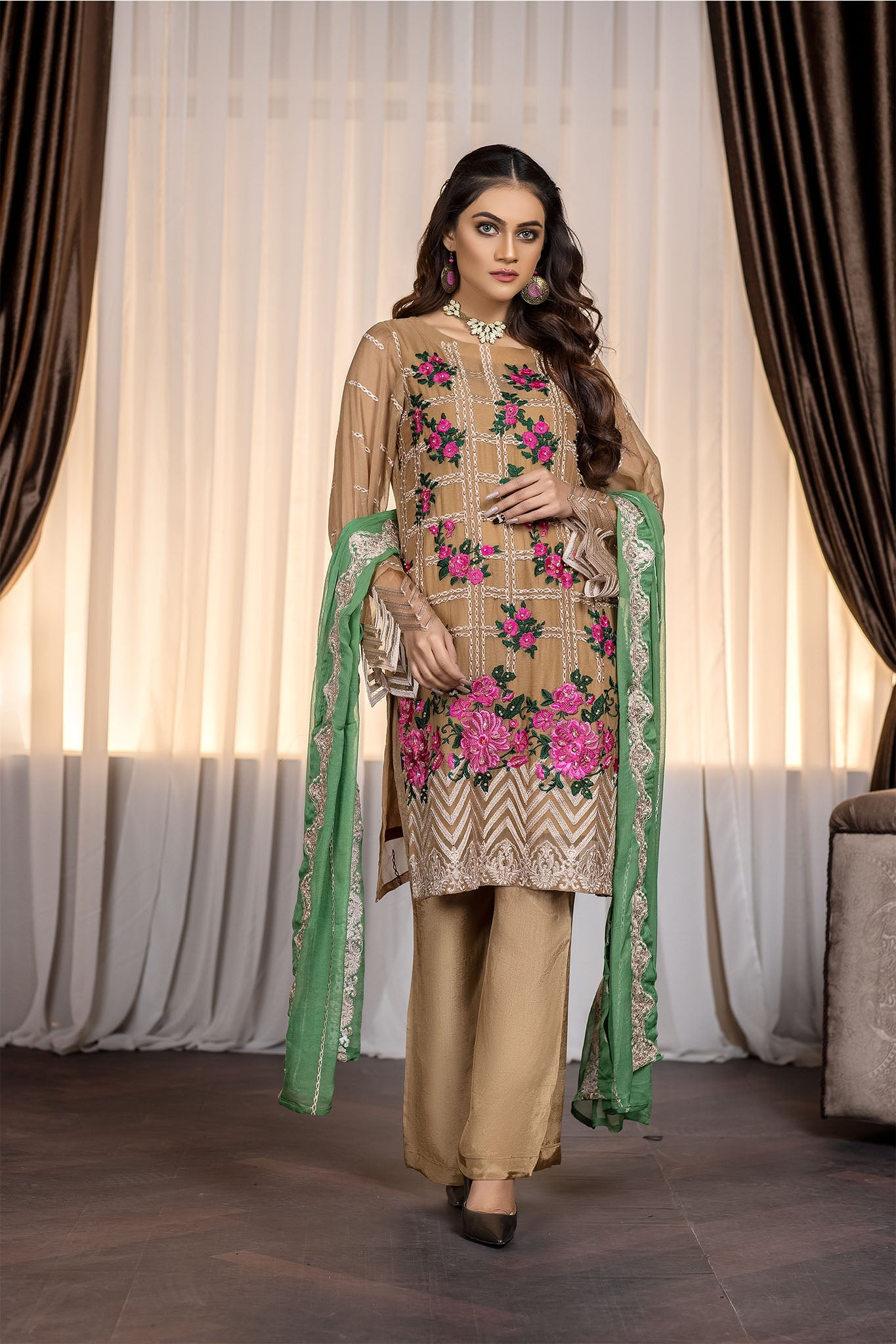 The beautiful brown is called Radiant Season for a purpose. The classy handwork in off-white color covers the entire front of the shirt. This work is merged smartly with pink color flowers that you cannot resist the piece. The sleeves are also covered with off-white lines, whereas, the Russian grip trouser of this luxury pret collection is in brown matching color. The green contrasting dupatta enhances the look, which is also full of embroidery on the borders and in middle.