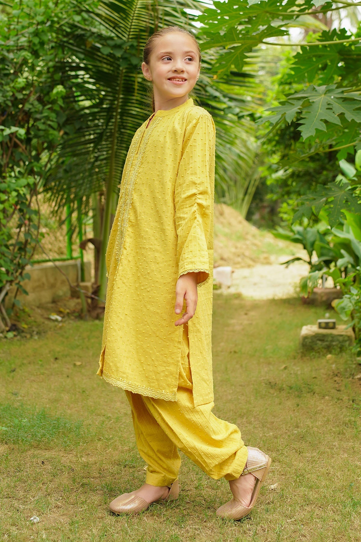 Top: Yellow Cotton Broshia Kurta With LacesBottom: Yellow Cotton Broshia Shalwar