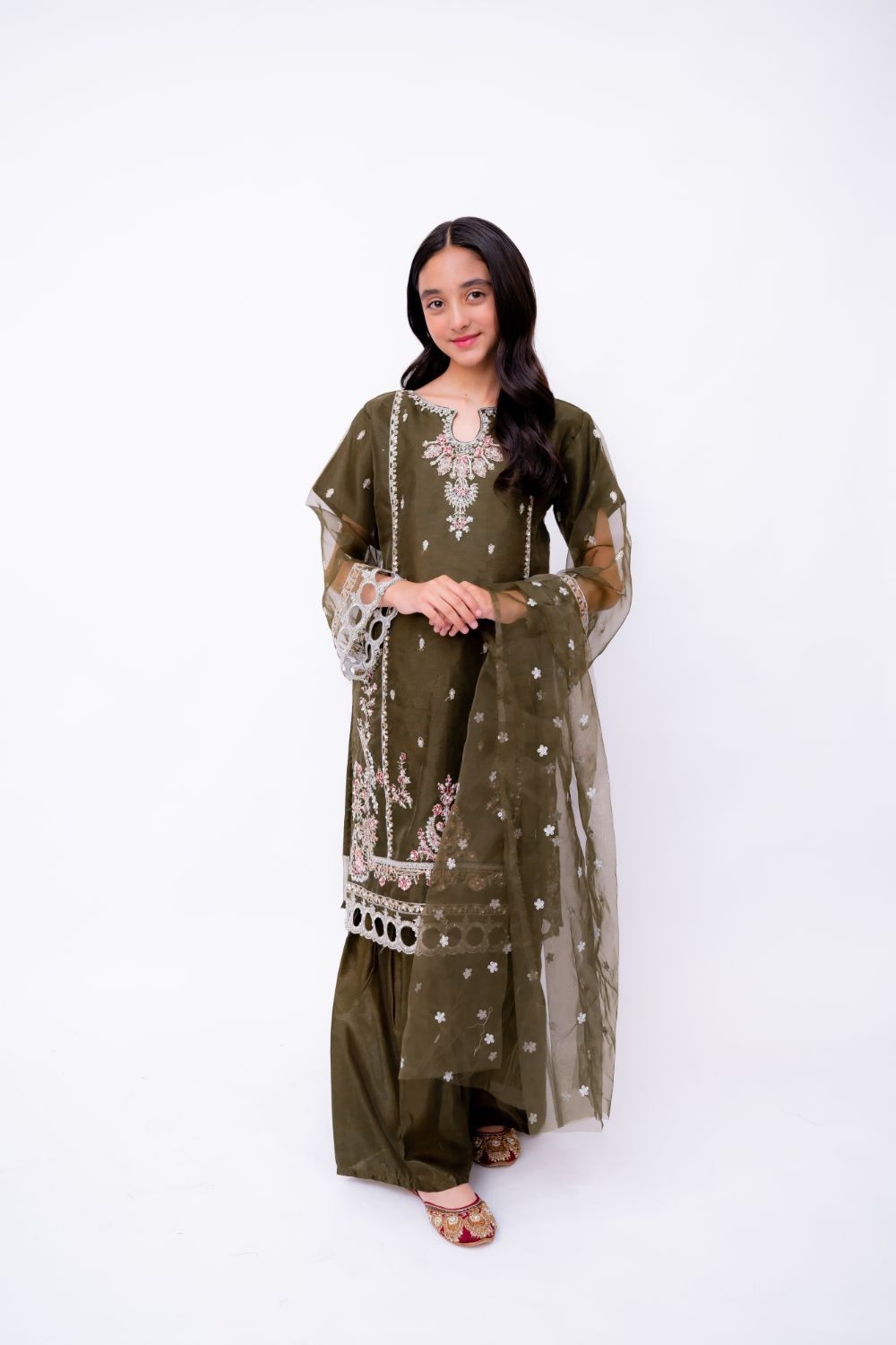 3 - Piece Embroidered Shirt, Dupatta and gharara This elegant 3-piece embroidered shirt, featuring a distinctive hole in the neck, pairs beautifully with a stylish gharara for a modern yet traditional look
