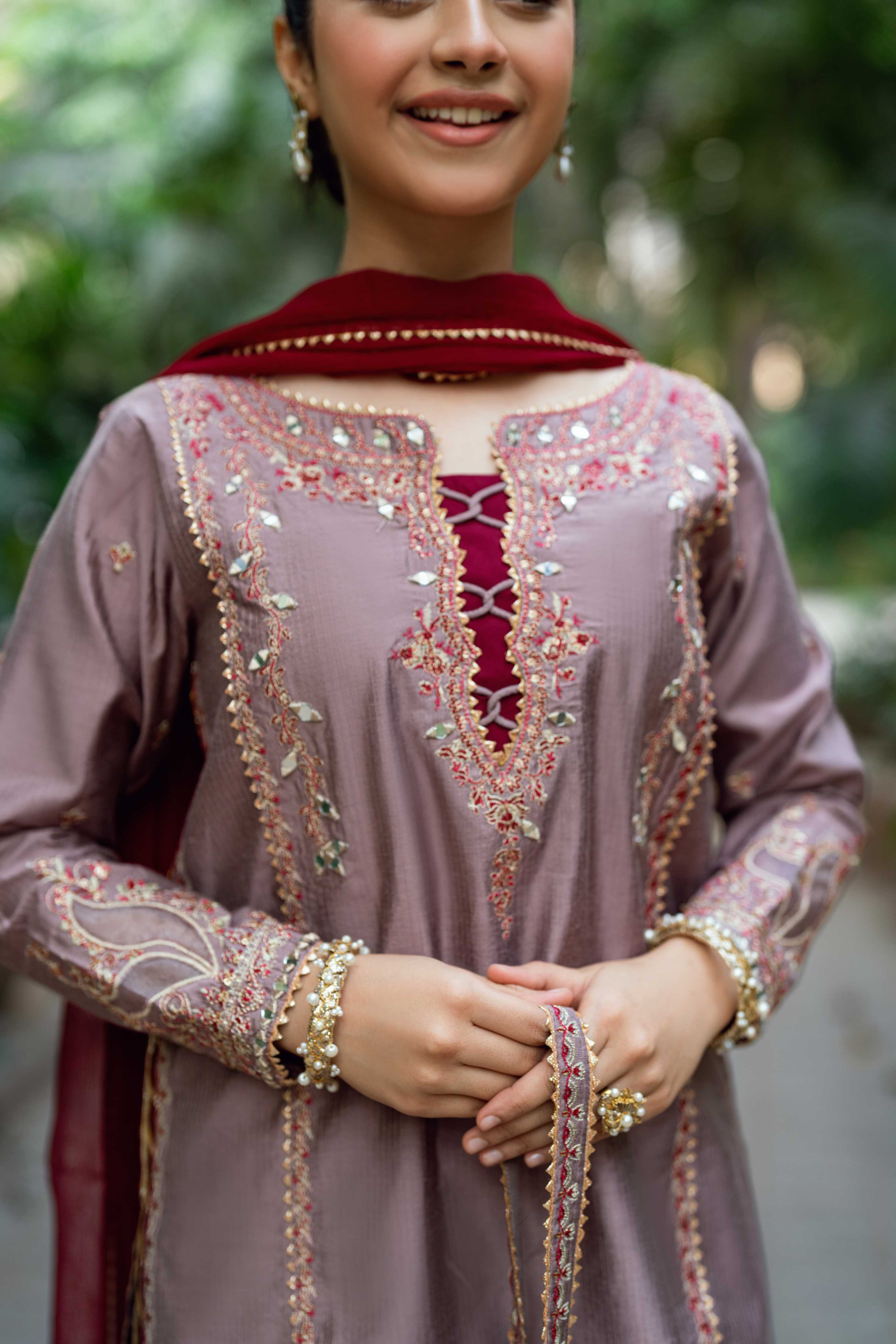 Shirt: Mauve Cotton Susi short shirt with loops detail on neckline, all-over sheesha touching with intricate embroidery design. Organza patchwork design on sleeves and daman cut completes the look with complementing chatapatti details.