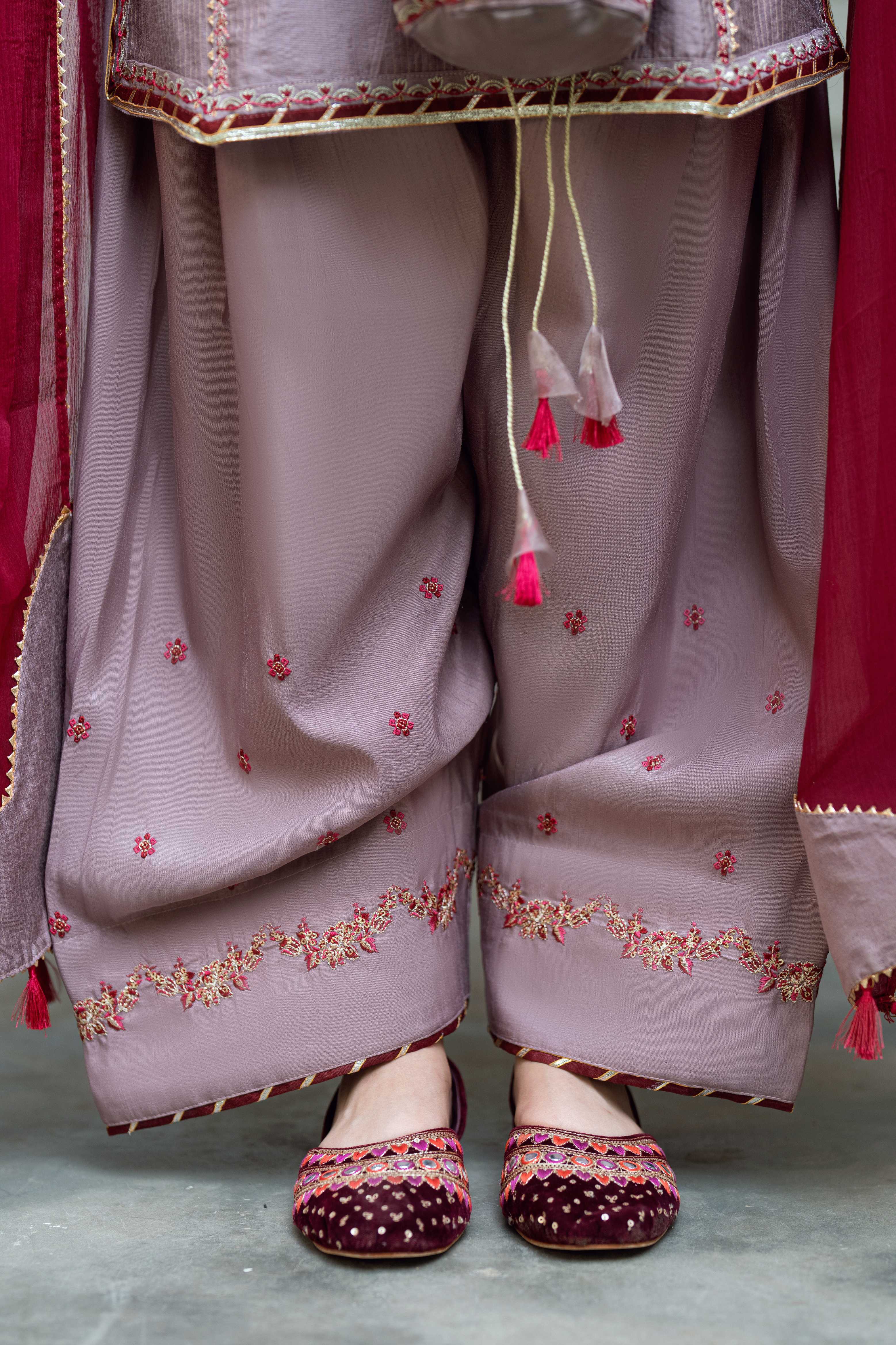 Trousers: Matching rawsilk farshi shalwar with intricate embroidery, finished with maroon chatapatti lace.