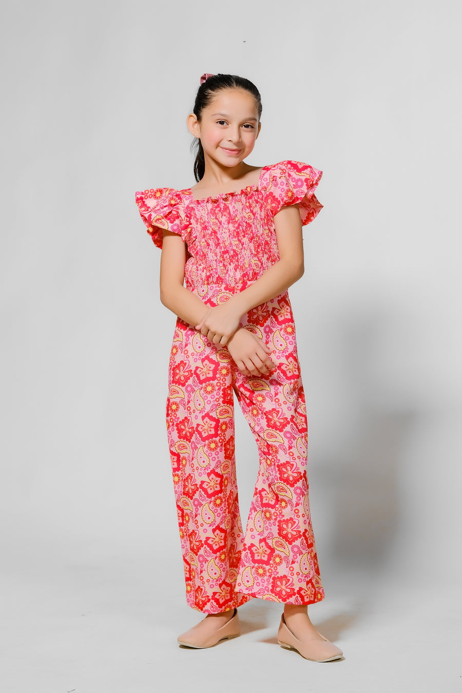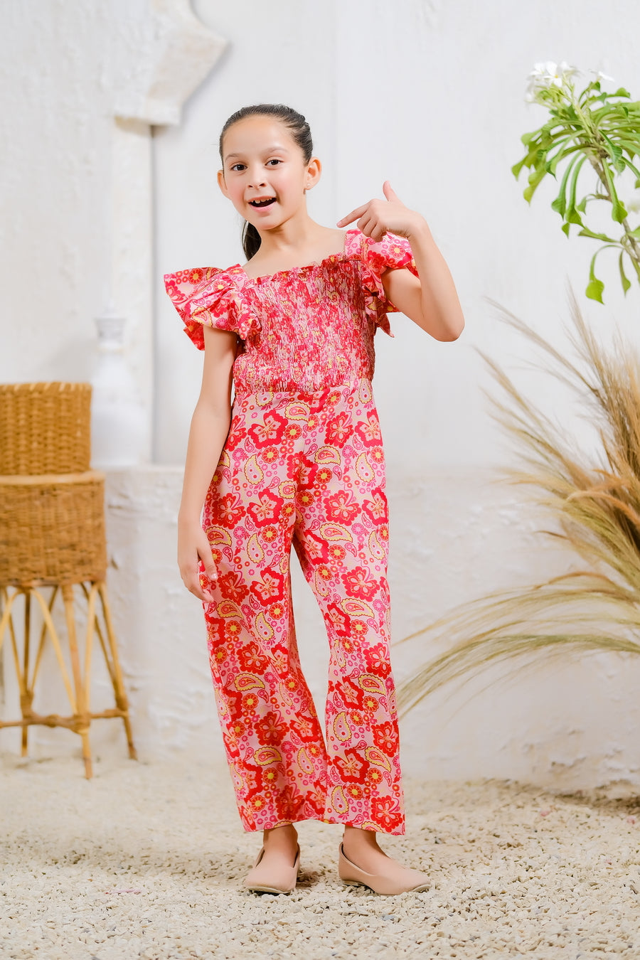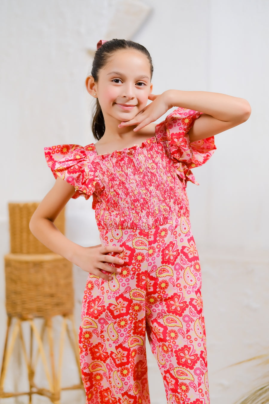 Add a touch of vintage charm to your child's wardrobe with the Scarlet Paisley Jumpsuit. The intricate paisley patterns in shades of red and pink create a beautiful and classic look. The smocked bodice and ruffled sleeves offer a comfortable yet stylish fit, perfect for any event.