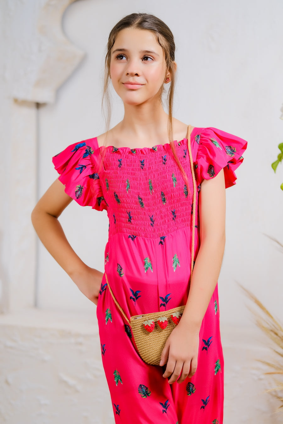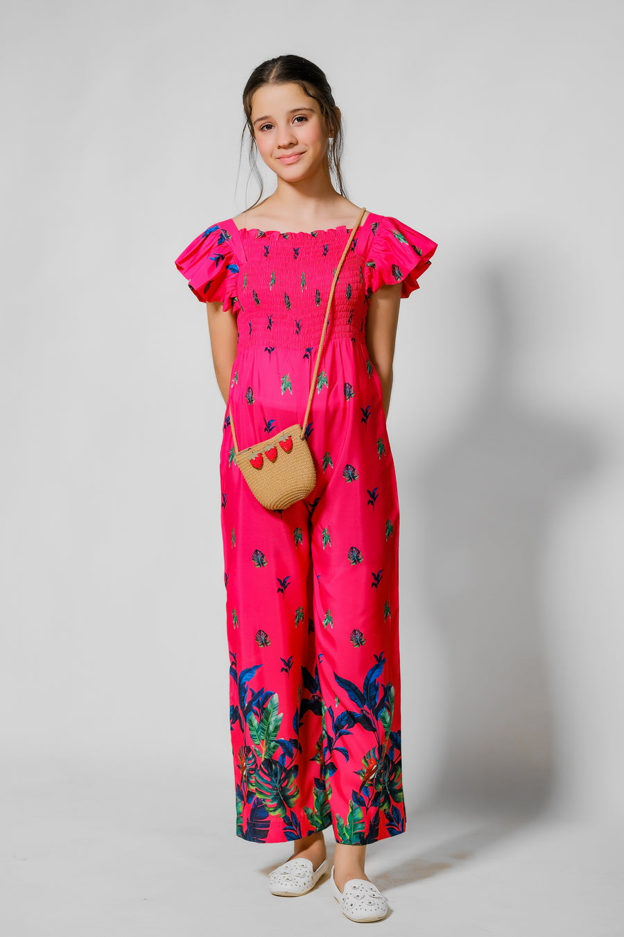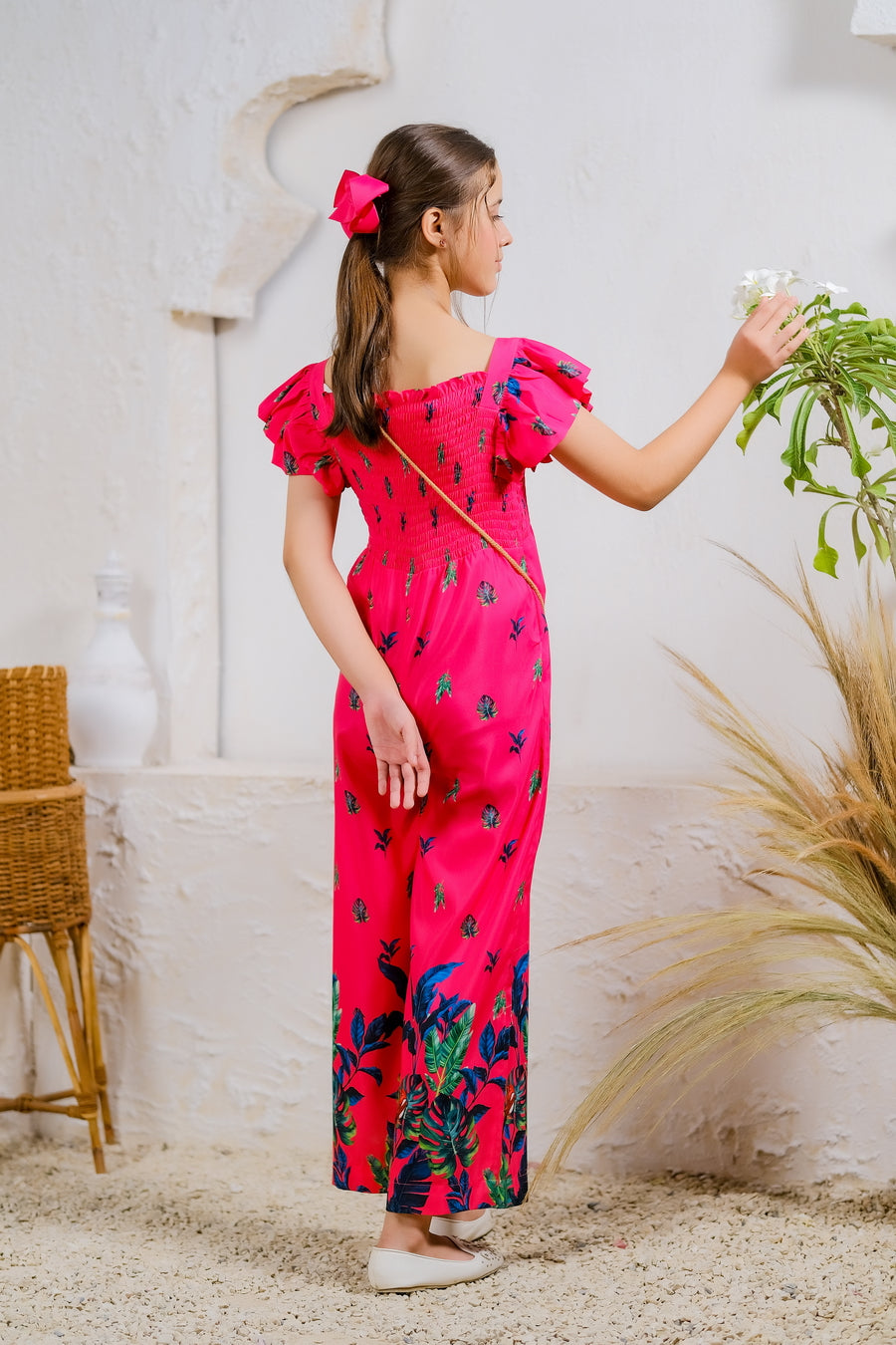 Brighten up the day with the Coral Blossom Jumpsuit, featuring a radiant coral pink base with charming floral prints. The smocked bodice and ruffled sleeves add a sweet touch, making it an ideal choice for special occasions and everyday fun.