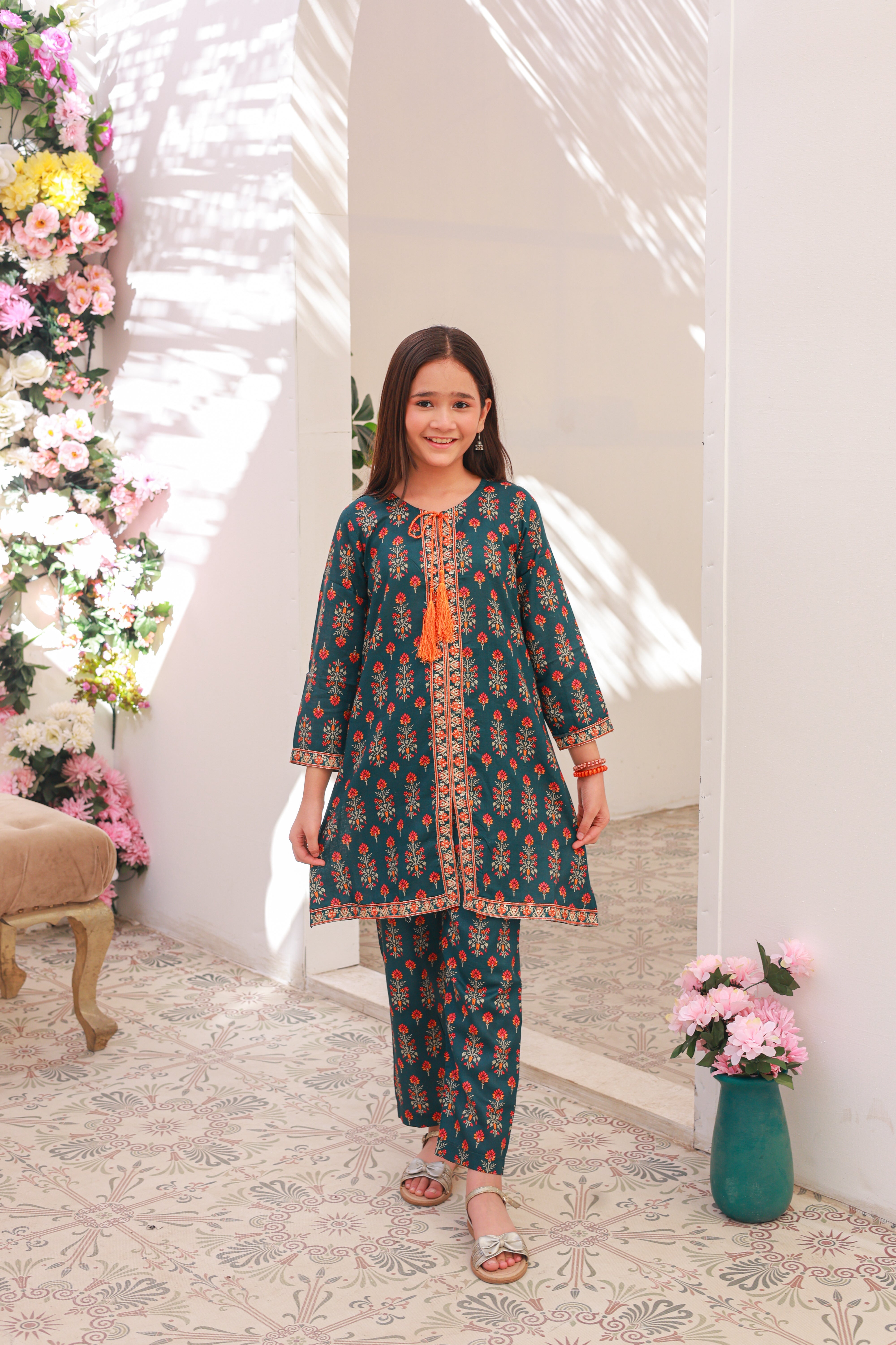 Enhance your child's wardrobe with Khanak's Printed and Embroided Lawn Stitched 2-Piece set. This stylish ensemble includes a digitally printed shirt and cozy trousers, making it the ideal choice for casual outings or fun-filled adventures.