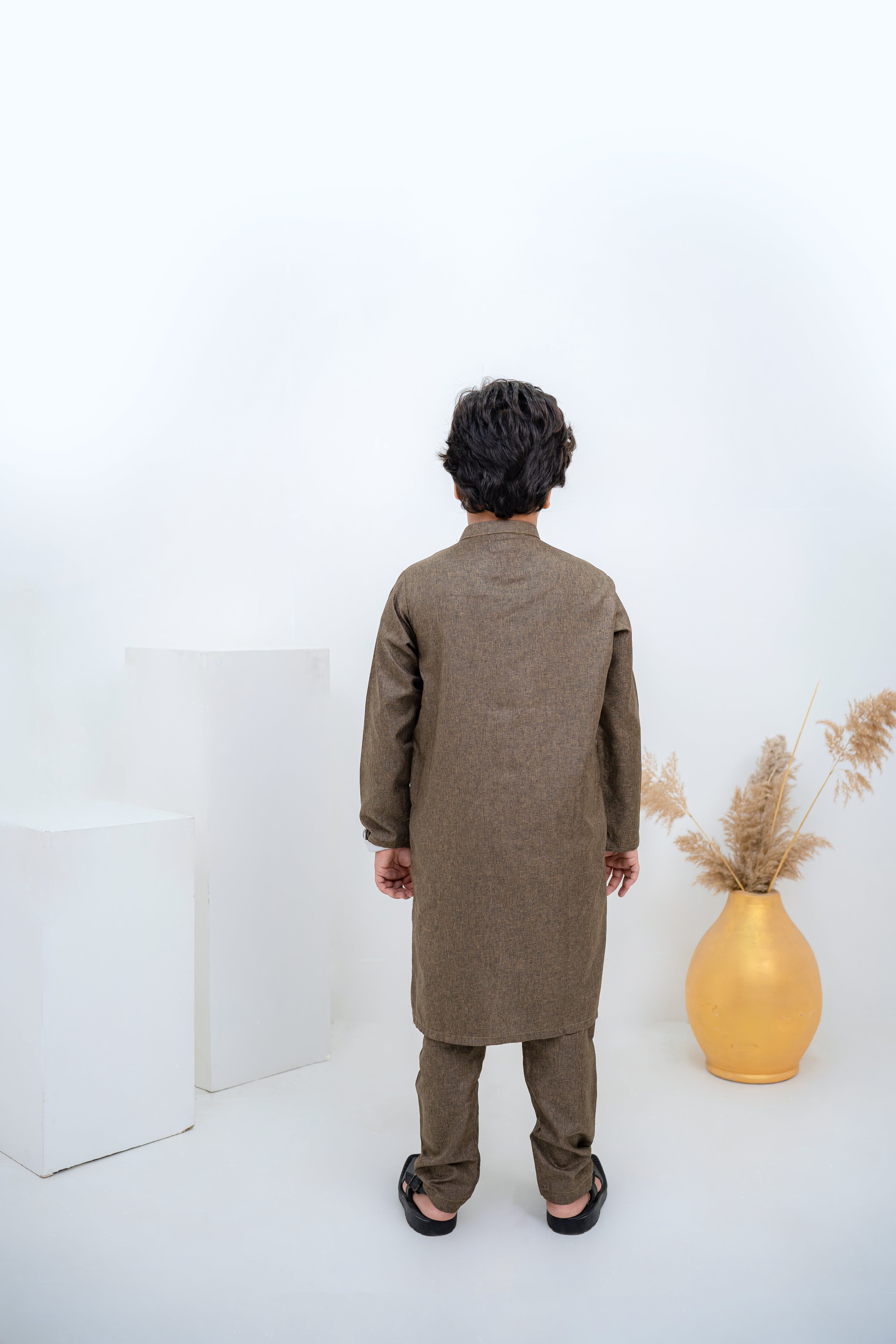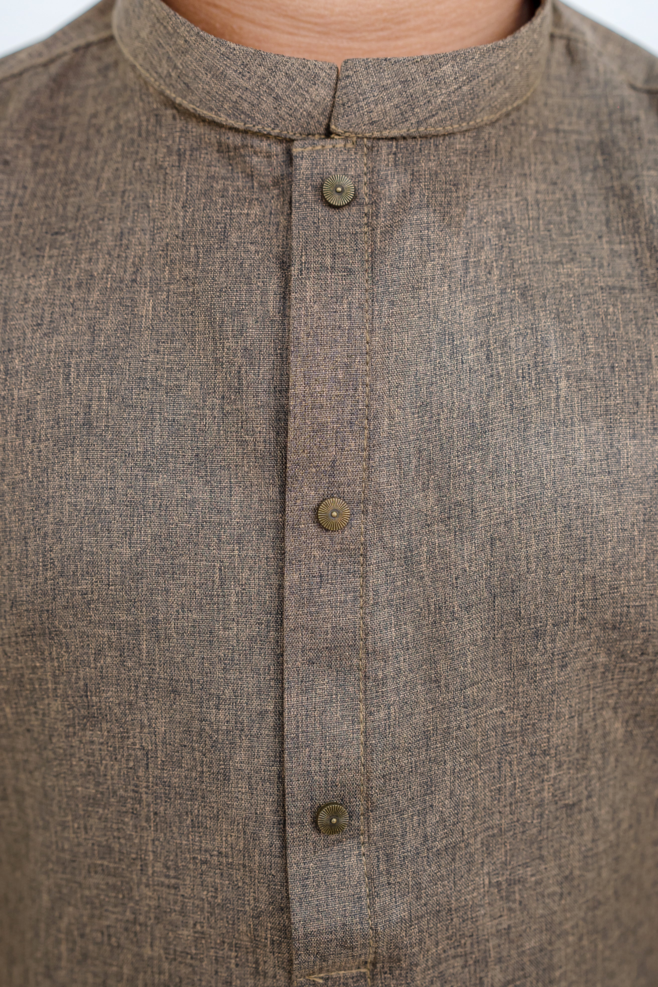 This elegant Daily/Basic Wear Kurta Set features a Wash & Wear shirt and trouser in a sophisticated Saddle Brown hue. The top boasts a stylish Mandarin collar, while the bottom is designed with a Straight Trouser style. Perfect for all seasons, this 2-piece set from Wearmani exudes timeless charm.