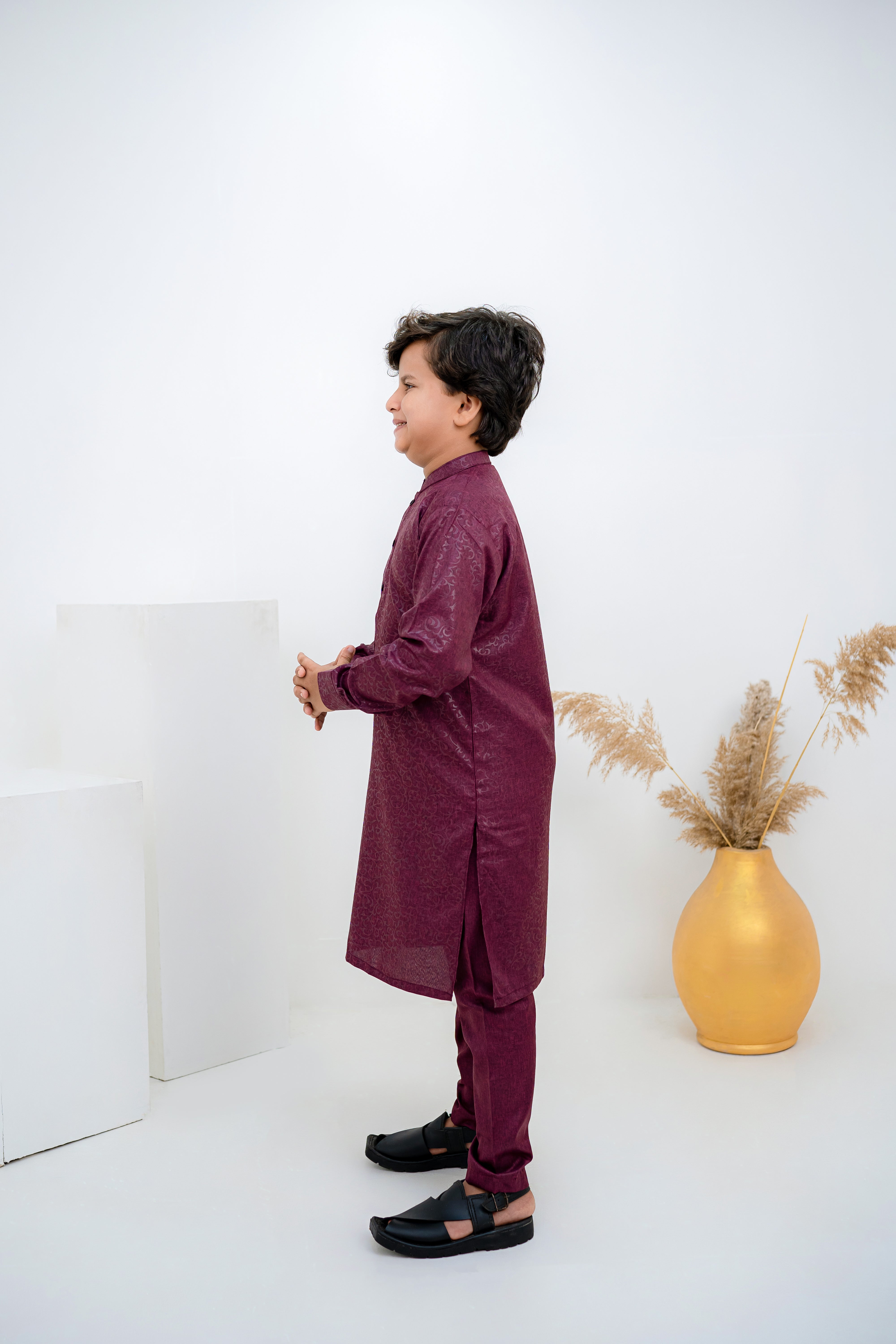 This exquisite Boy's 2 Piece Daily/Basic Wear Kurta Set features a sophisticated Mandarin Collar top in a claret color. The Wash & Wear fabrics offer comfort for all seasons. The straight trouser bottom adds a touch of elegance, making it perfect for any occasion. Elevate your little one's style with this Wearmani ensemble.