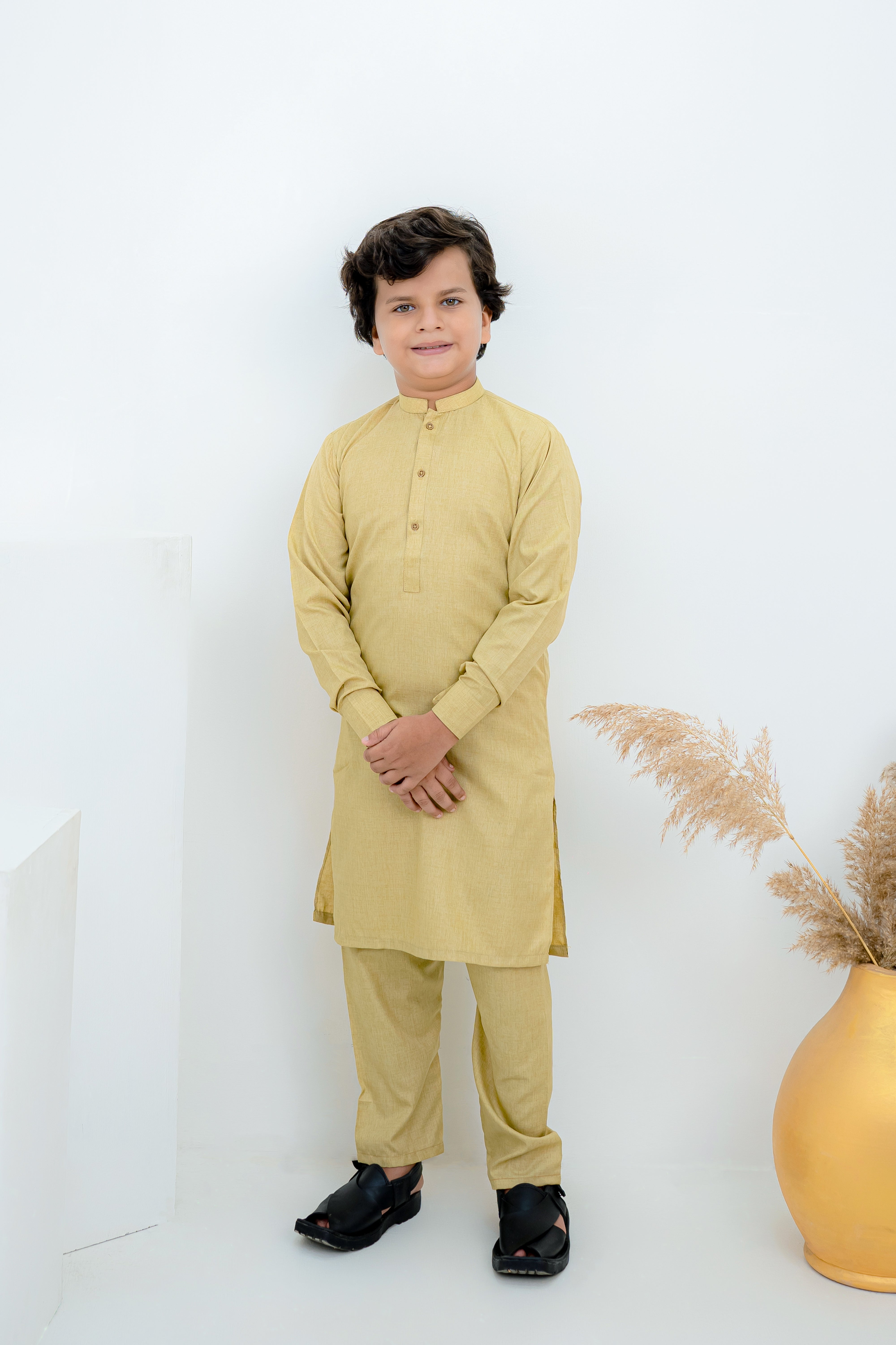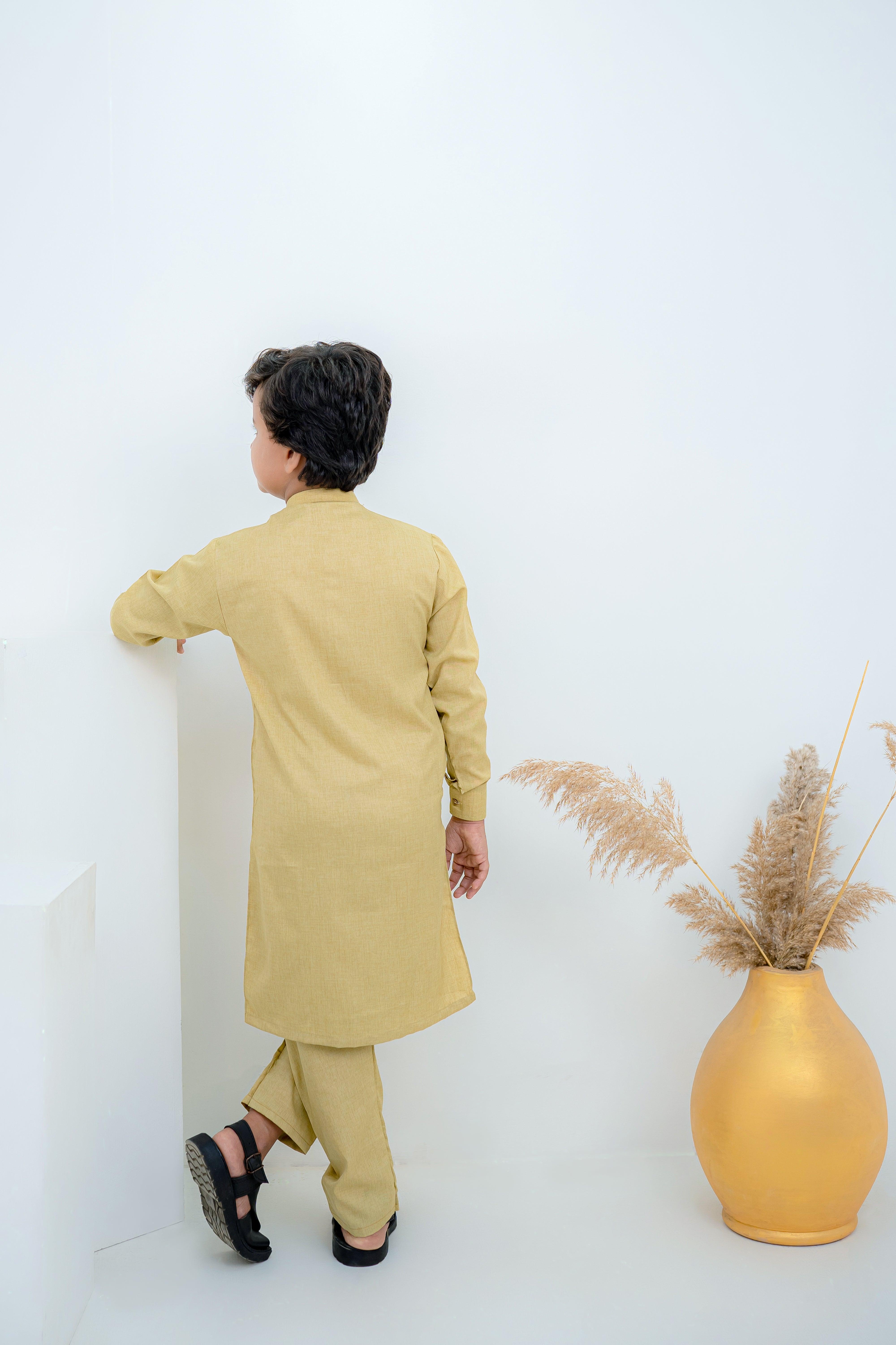 This exquisite Boy's 2 Piece Kurta Set in Mustard is perfect for daily wear. The Mandarin Collar top and Straight Trouser bottom are crafted from easy-care Wash & Wear fabrics, ensuring comfort in all seasons. The rich color and traditional design make this set a standout choice. Elevate your little one's style with this chic ensemble from Wearmani.