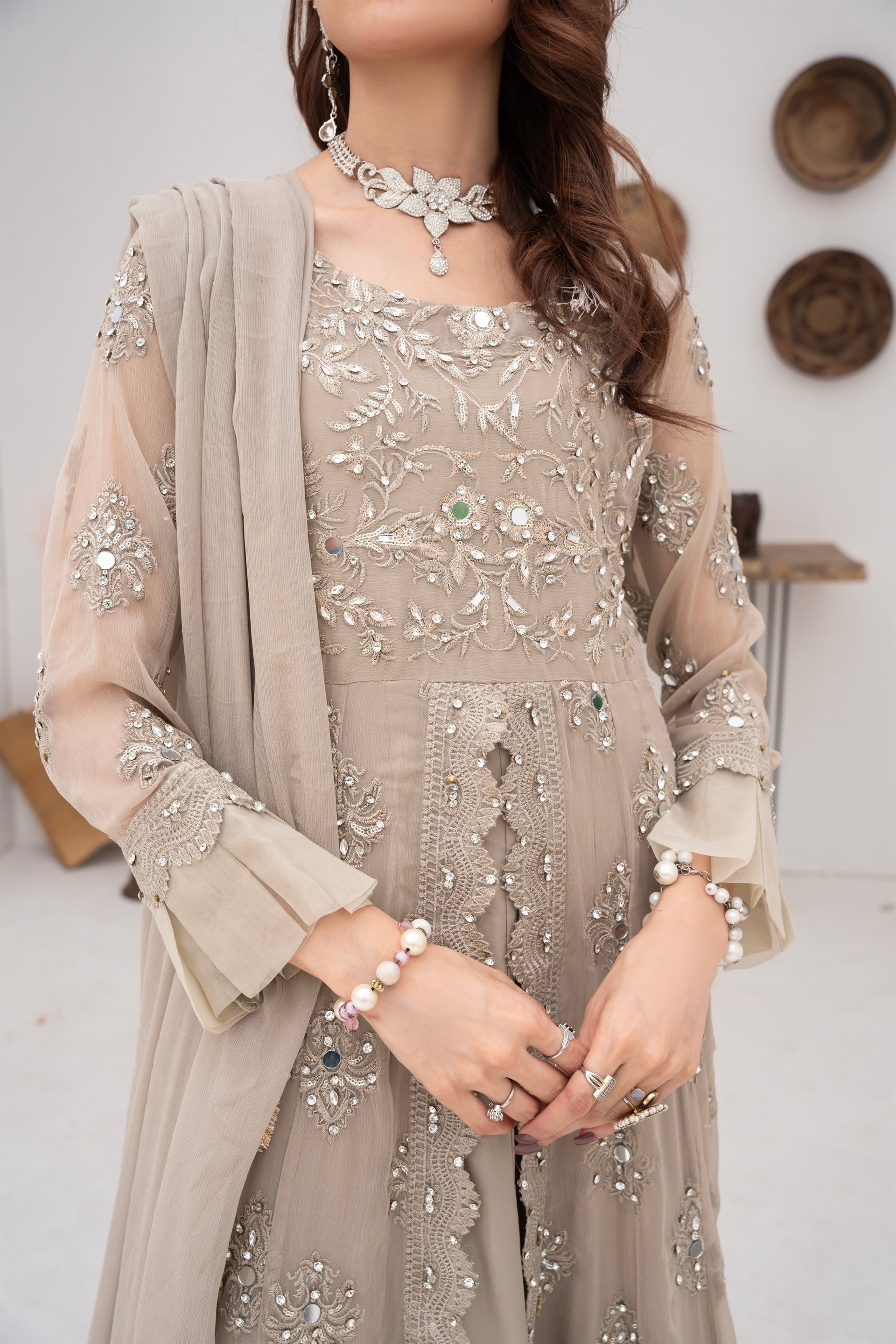 Additional Description: There is exquisite embroidery work in vertical patterns, which exudes grace and elegance, is a marvel of craftsmanship and design. The designer's exquisite use of the zari, sitara, stone work , mirror work and sequin embroidery technique enhances this lovely dress. A gorgeous chiffon dupatta with a kiran lace border completes the ensemble. Make use of Mona Embroidery to showcase your individual style and embrace it. Note: Measurements very according to designs. Colors may appear slightly different. Remember: Dry Clean Only.