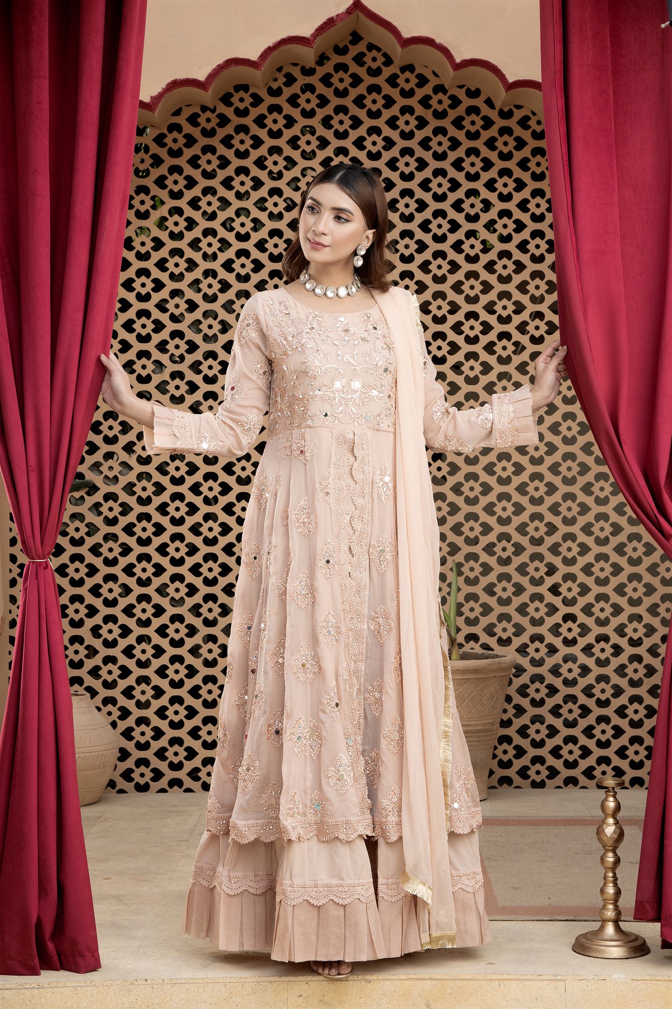 There is exquisite embroidery work in vertical patterns, which exudes grace and elegance, is a marvel of craftsmanship and design. The designer's exquisite use of the sitara, stone work , mirror work and sequin embroidery technique enhances this lovely dress. A gorgeous chiffon dupatta with a kiran lace border completes the ensemble. Make use of Mona Embroidery to showcase your individual style and embrace it.