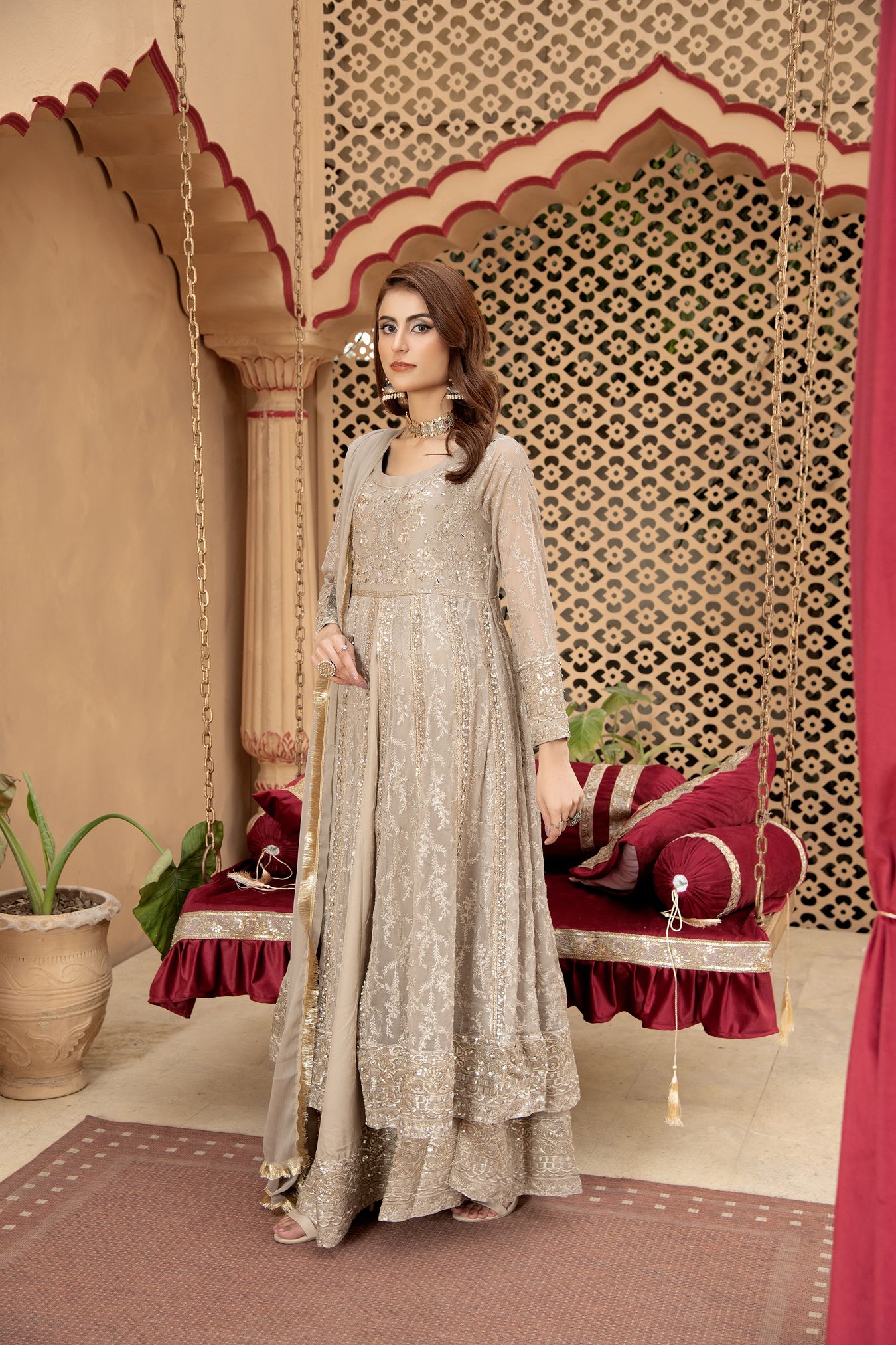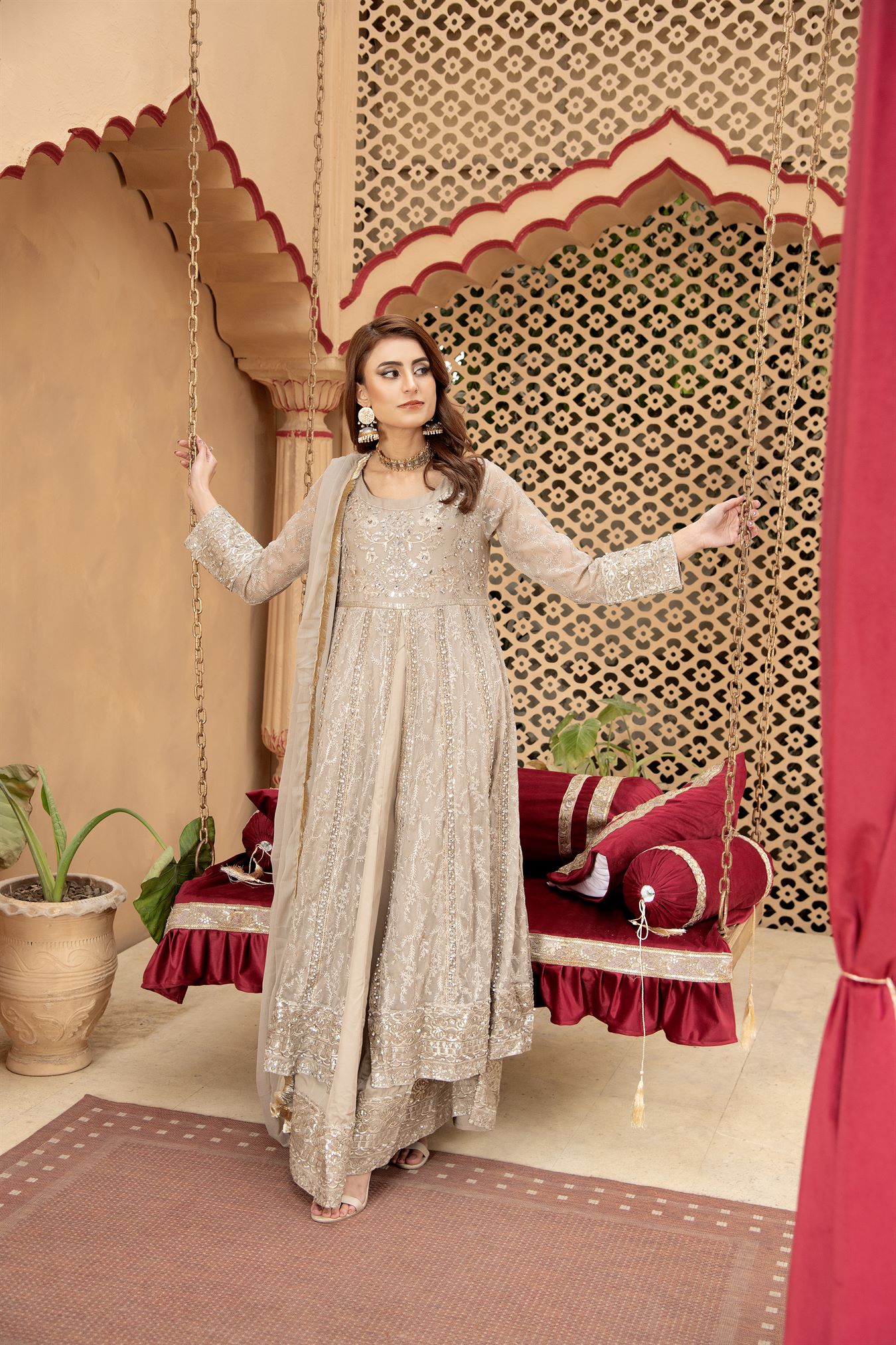 There is exquisite embroidery work in vertical patterns, which exudes grace and elegance, is a marvel of craftsmanship and design. The designer's exquisite use of the sitara, stone work , and sequin embroidery technique enhances this lovely dress. A gorgeous chiffon dupatta with a kiran lace border completes the ensemble. Make use of Mona Embroidery to showcase your individual style and embrace it.
