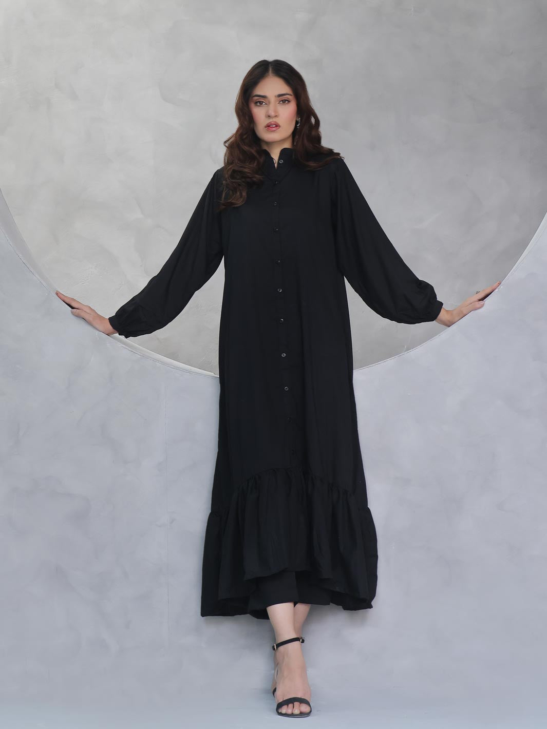 The ruffled frock is a stylish and elegant black dress that features a full skirt and a collar. The dress is designed to be comfortable and versatile, making it suitable for various occasions. The ruffles add a touch of sophistication to the overall look, while the full frock provides a flattering and feminine silhouette. This dress can be worn to formal events, such as a chic outfit for a night out with friends. The black color of the dress is timeless and versatile, allowing it to be easily paired with different accessories and shoes to create a variety of looks