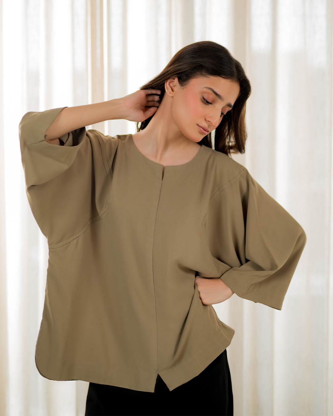 The Latte shirt features a relaxed silhouette with intricate panel cuts, finished with contrast color thread stitching for subtle detailing. Its flowy structure and minimalist neckline make it a versatile piece, blending comfort with understated elegance.