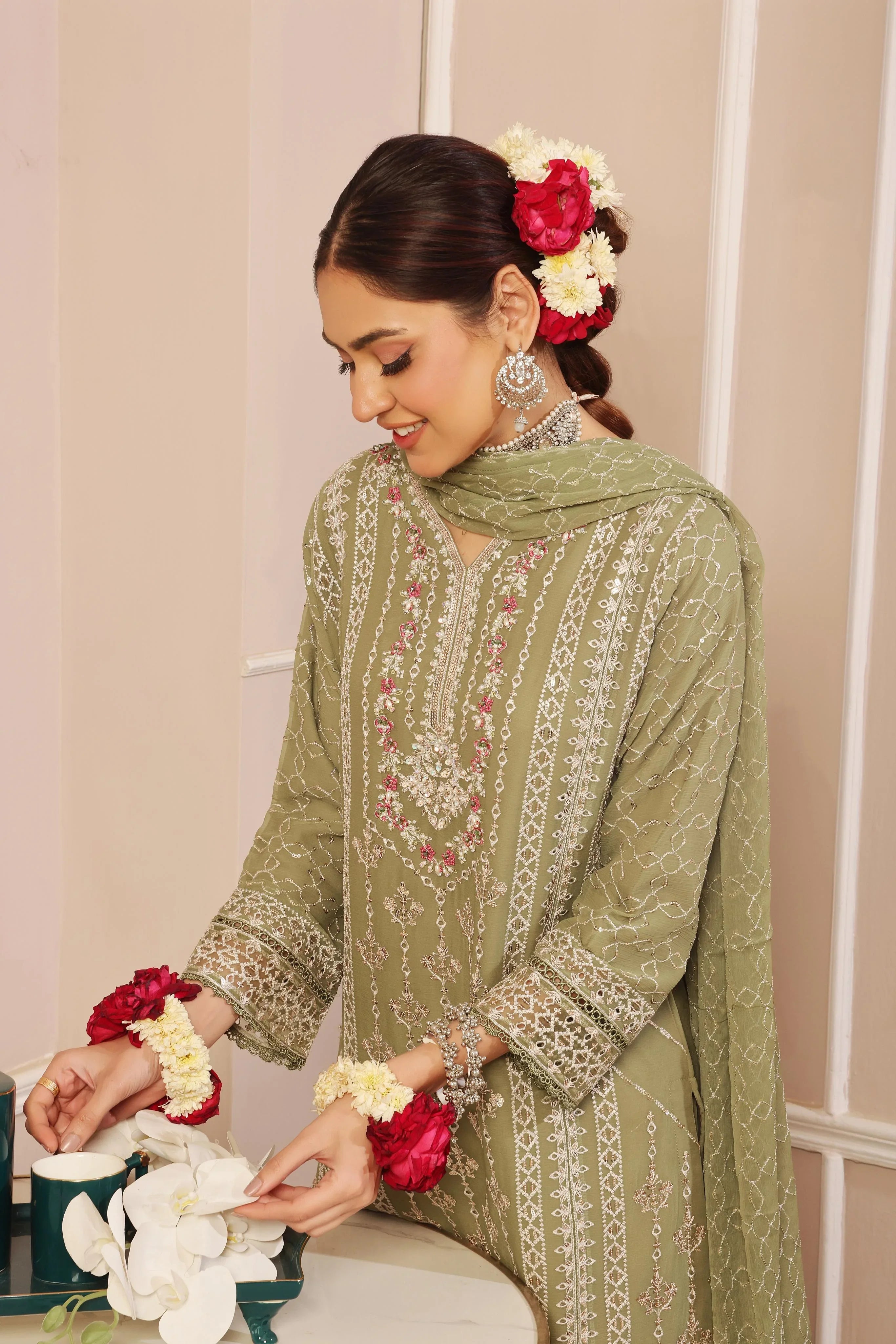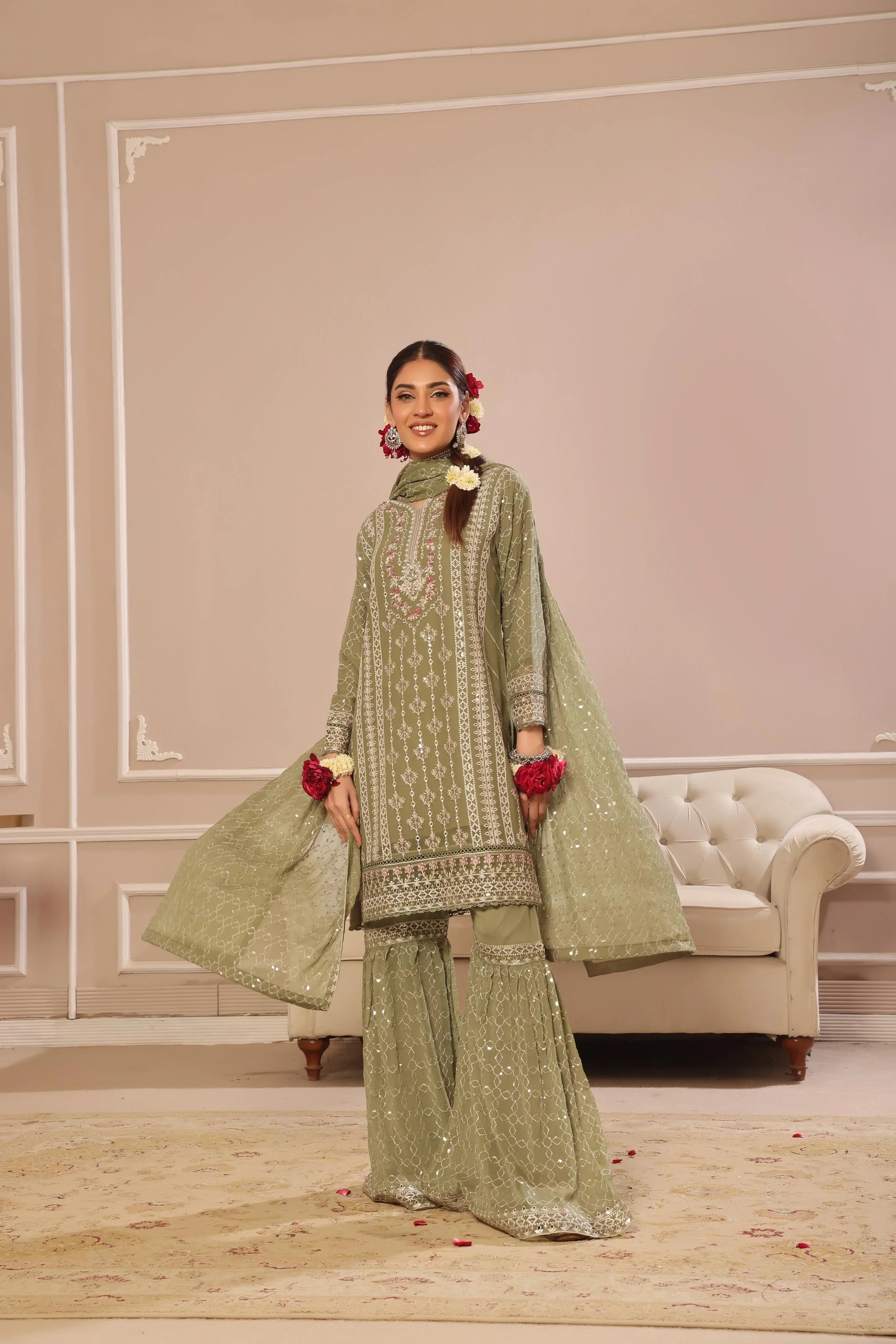 Elevate your style with our Luxury Chiffon Gharara Collection, featuring exquisite embroidery and shimmering sequins for a glamorous look. Crafted from premium-quality materials, this ensemble ensures both elegance and durability. Perfect for special occasions, it adds a touch of sophistication to your wardrobe.