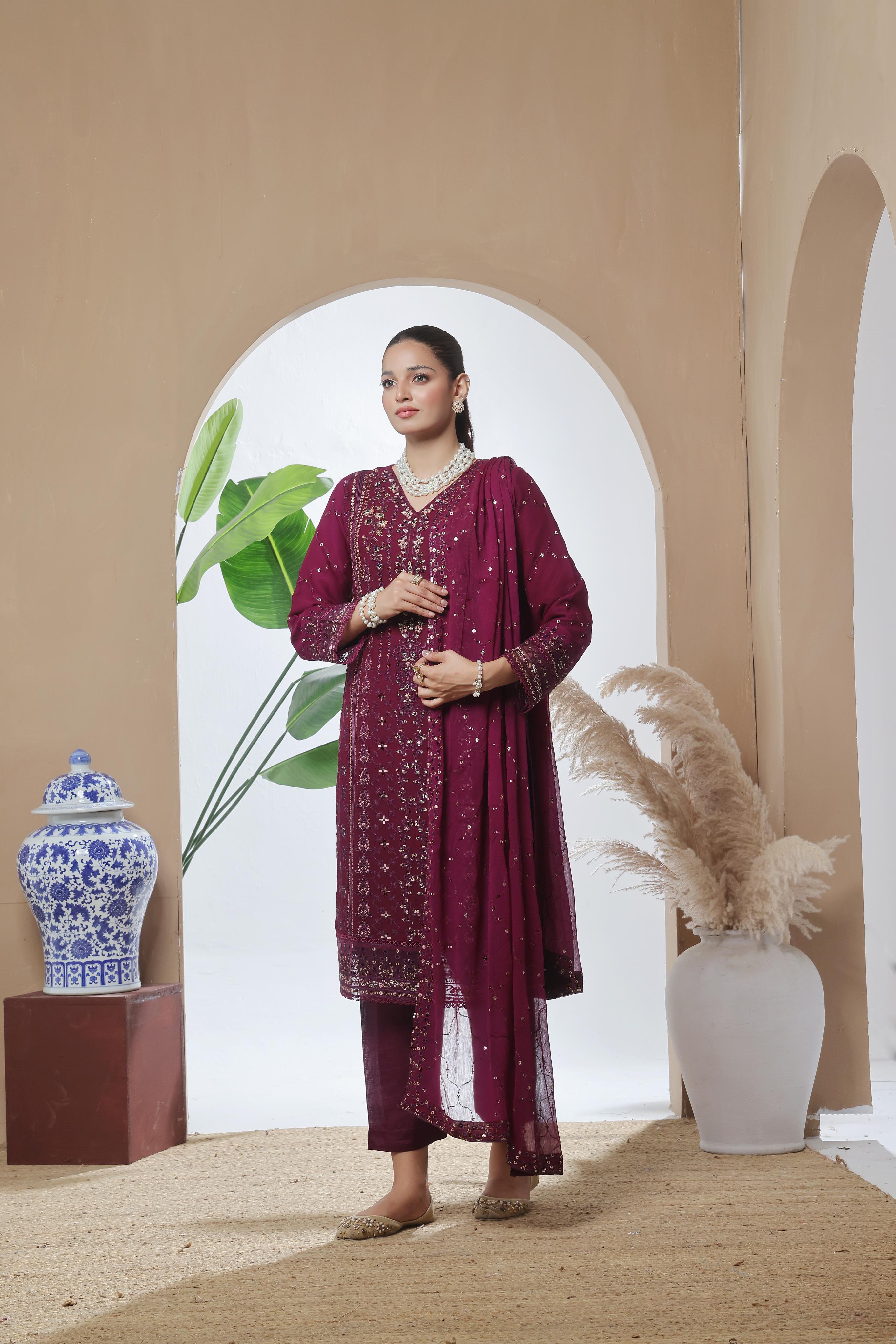 Luxury embroidered chiffon suit, stitched chiffon 3 piece suit, formal wear for women, party wear Pakistani suit, premium chiffon collection, hand embroidered dress online