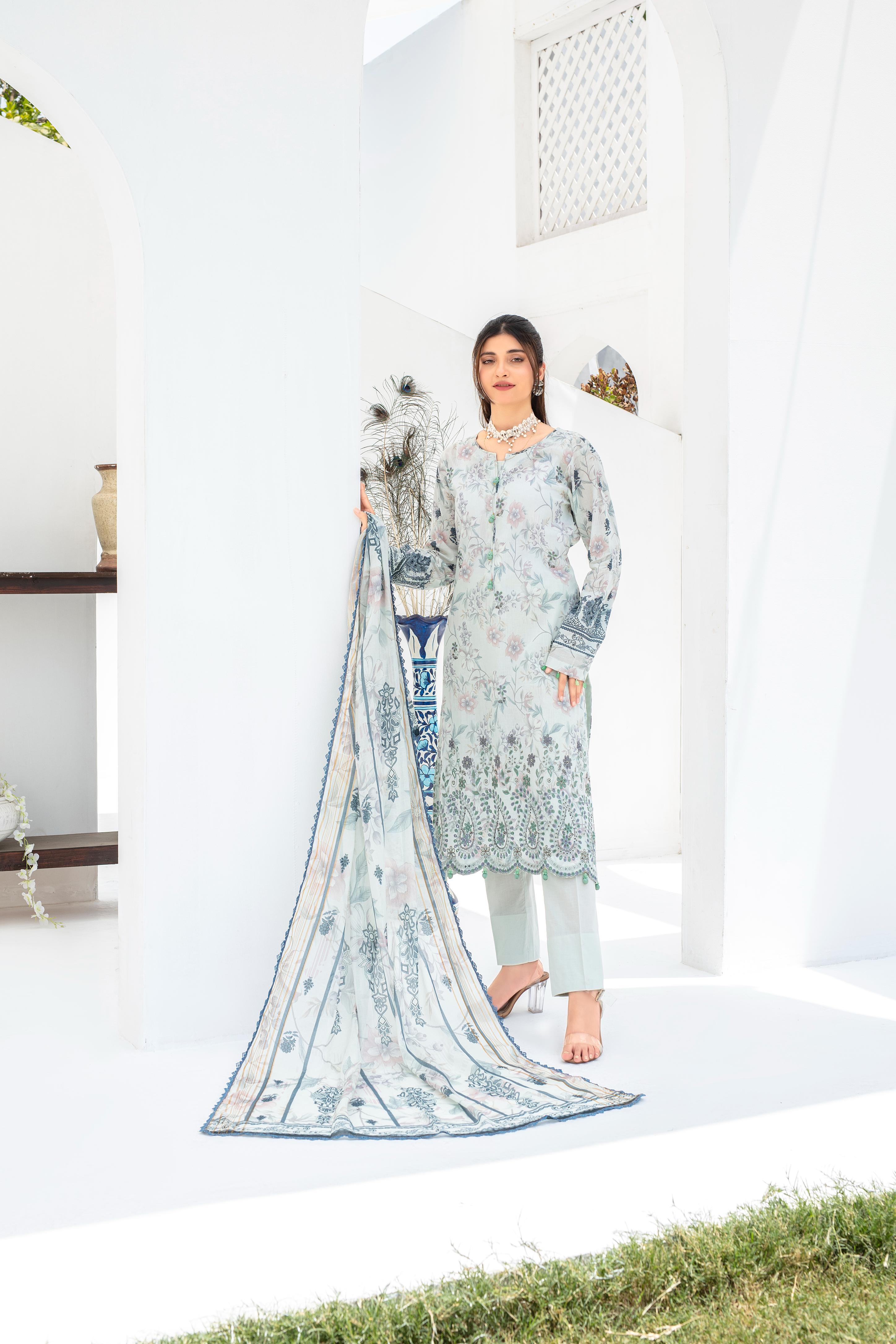 Designed for ultimate comfort and sophistication, the dyed cambric trouser perfectly complements the embroidered shirt and printed dupatta, making the outfit a harmonious masterpiece.
