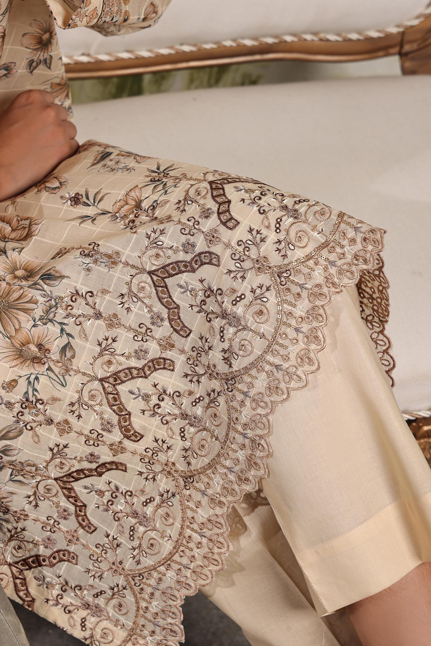 Embroidered Chikankari & LaserKari Slub Digital Printed Lawn Shirt ? Featuring intricate Chikankari & LaserKari embroidery on luxurious slub lawn, complemented by a stunning digital print that adds depth and beauty to the design.