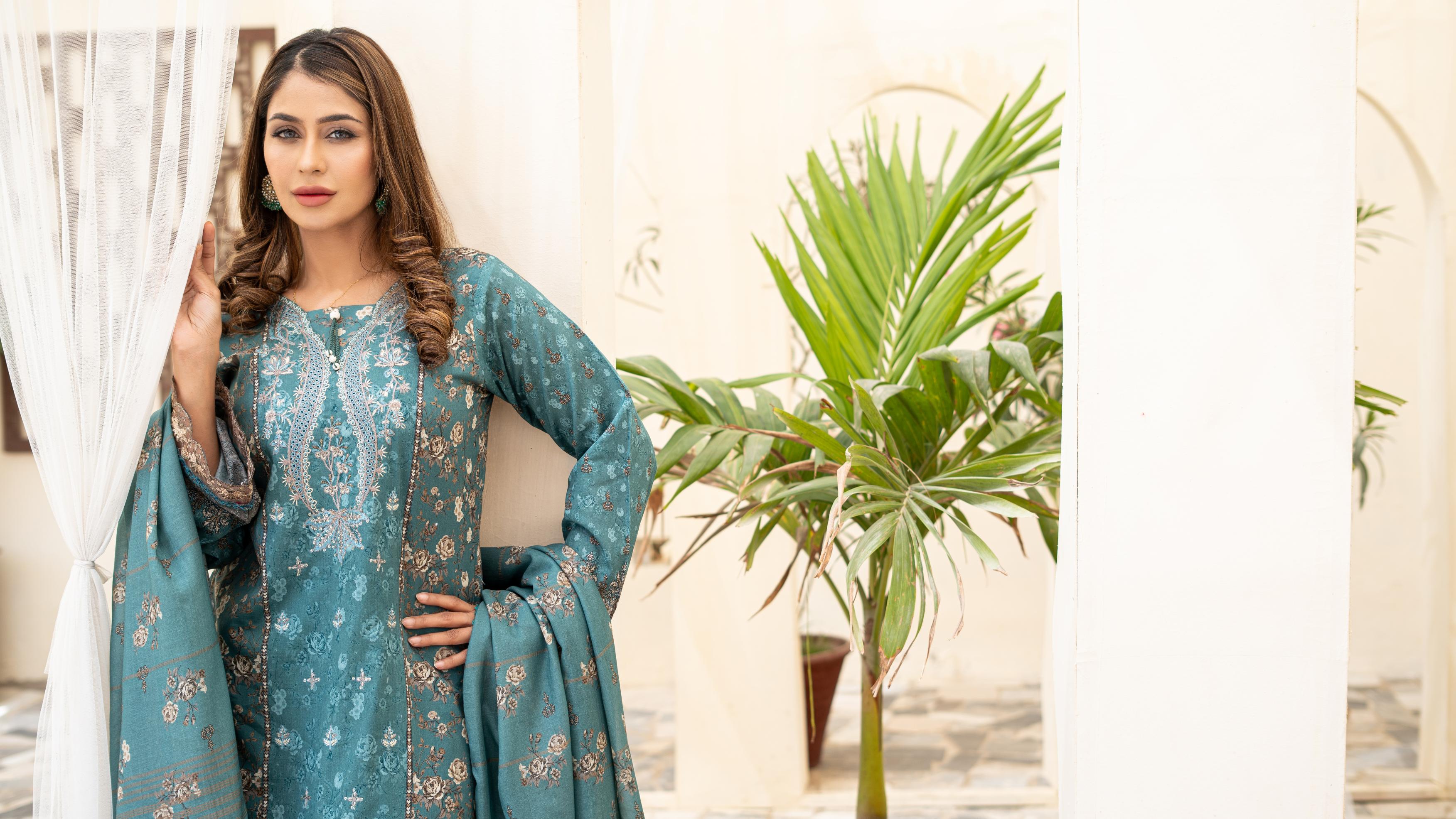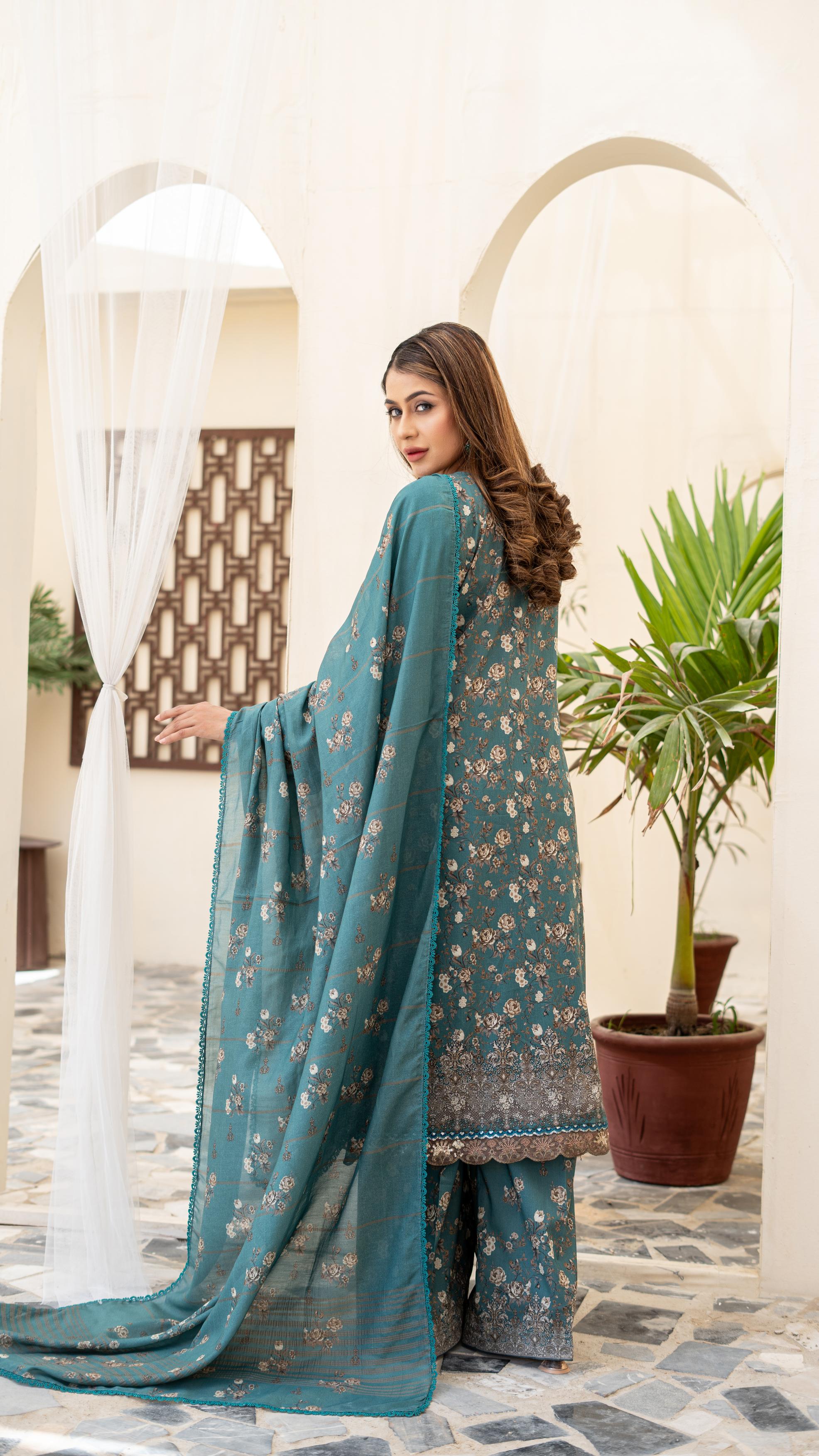 Diamond Zari Digital Printed Dupatta – A lightweight yet regal diamond zari dupatta with vibrant digital prints, adding a radiant and glamorous touch to your Eid look.
