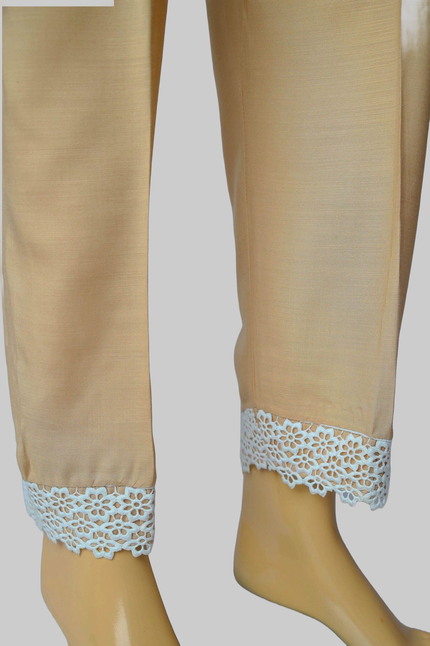 Ready to Wear Trouser. Solid Embellished Trouser with Bulky White Embroidery Lace at bottom.