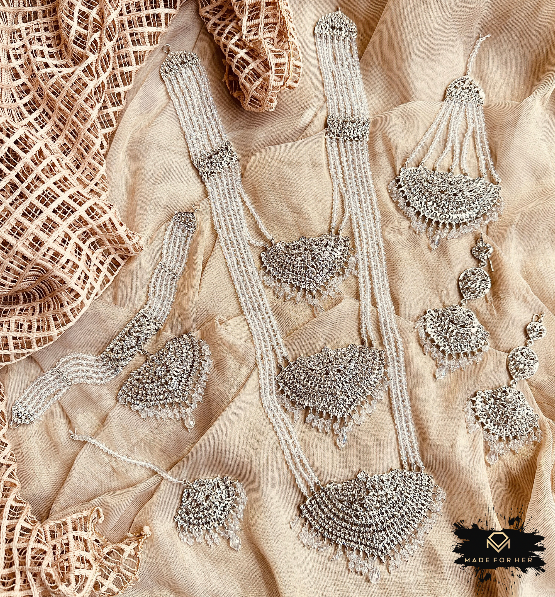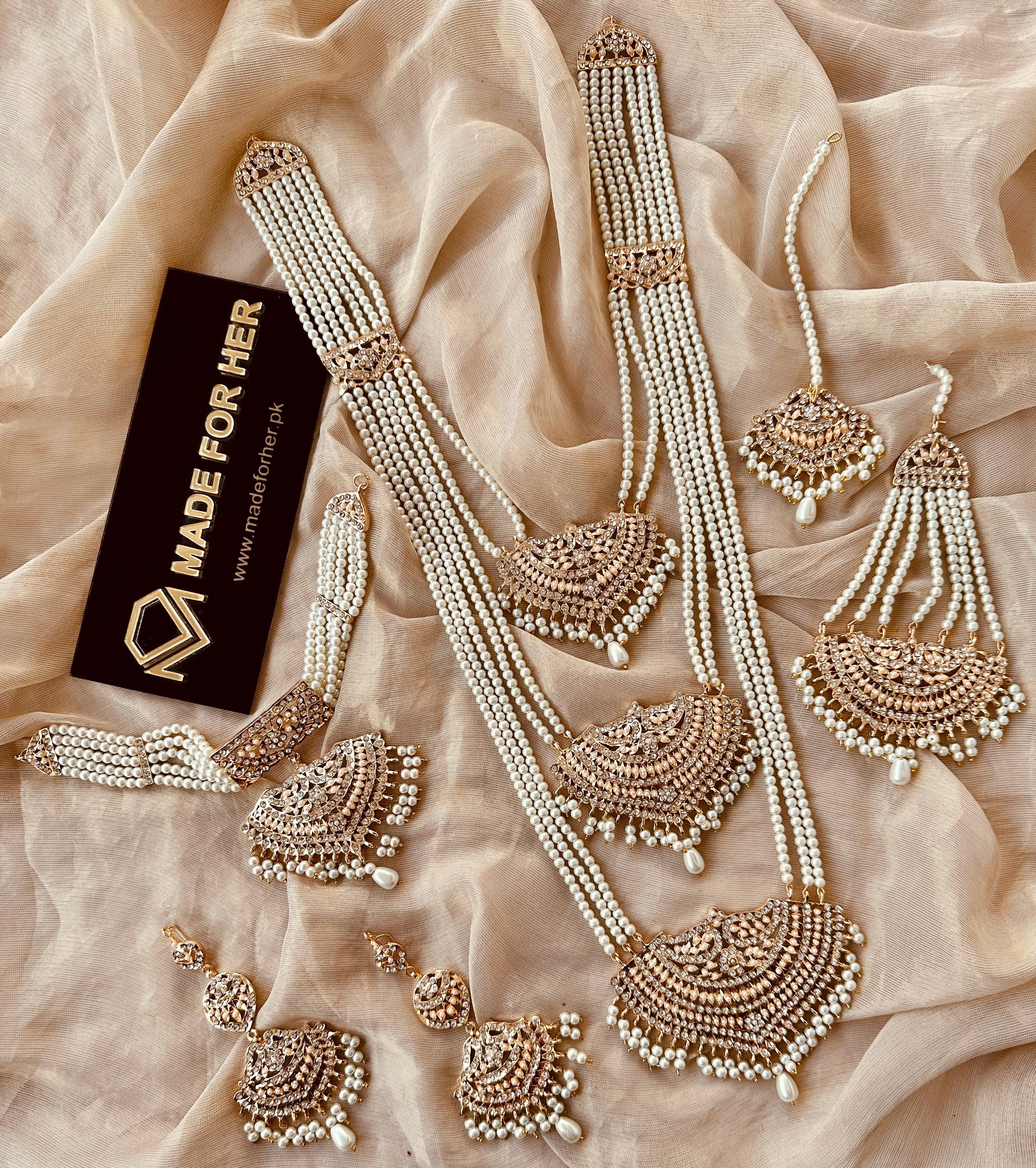 Embrace the grandeur of heritage with our Nizami Shehnaai 3-Layered Bridal Set, a masterpiece inspired by regal traditions. This exquisite bridal set features three majestic layers of meticulously handcrafted detailing, adorned with intricate stonework and elegant motifs that exude timeless royalty.