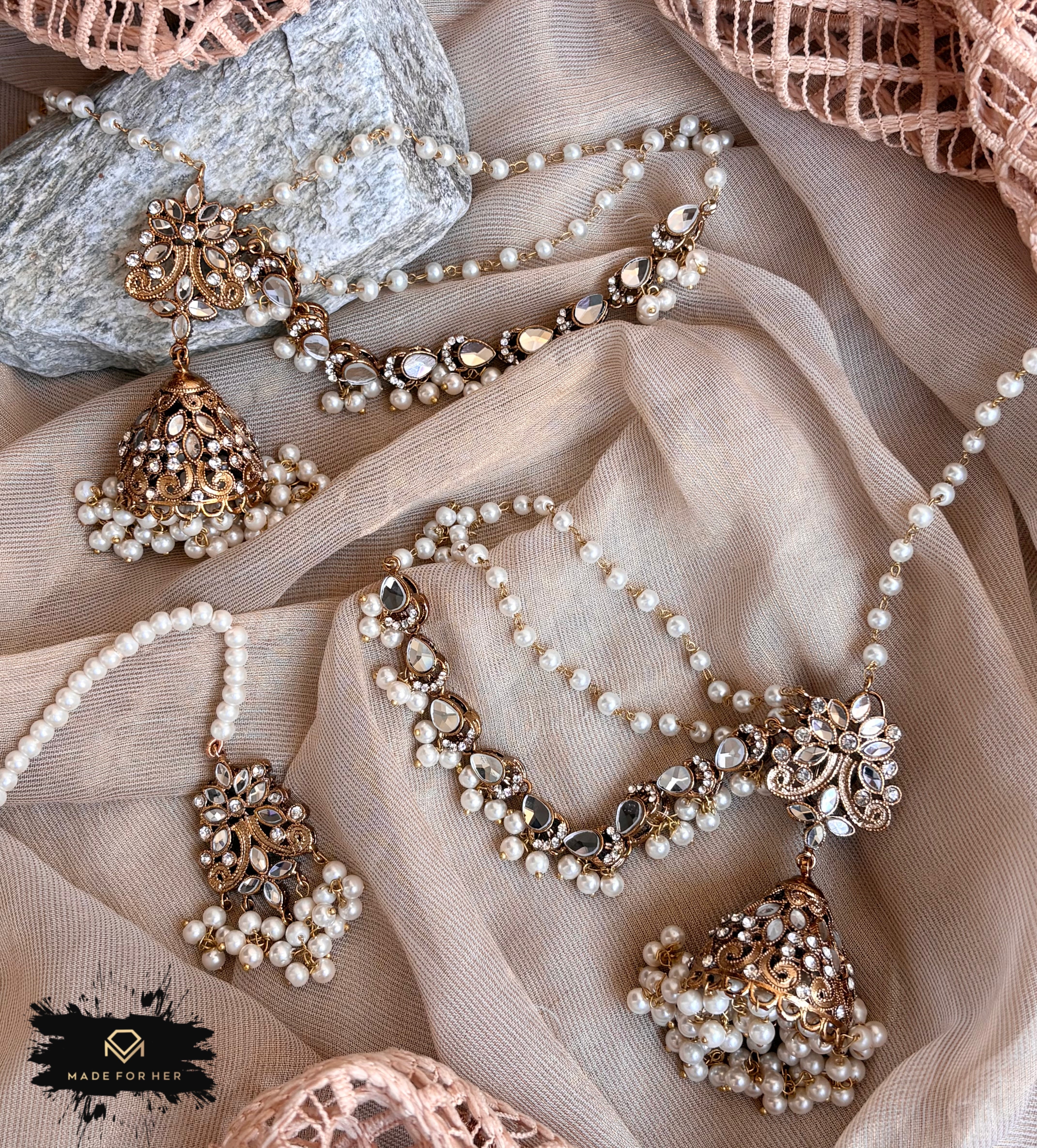 Qadeem Jhumki Tikka is a tribute to age-old craftsmanship and royal heritage. Finished in an antique tone, this jhumki and tikka set reflects the beauty of traditional jewellery once worn in mehfils and shaahi daur. The intricate detailing and classic jhumki drops create a graceful statement, making it perfect for weddings, mehndi functions, and festive occasions.