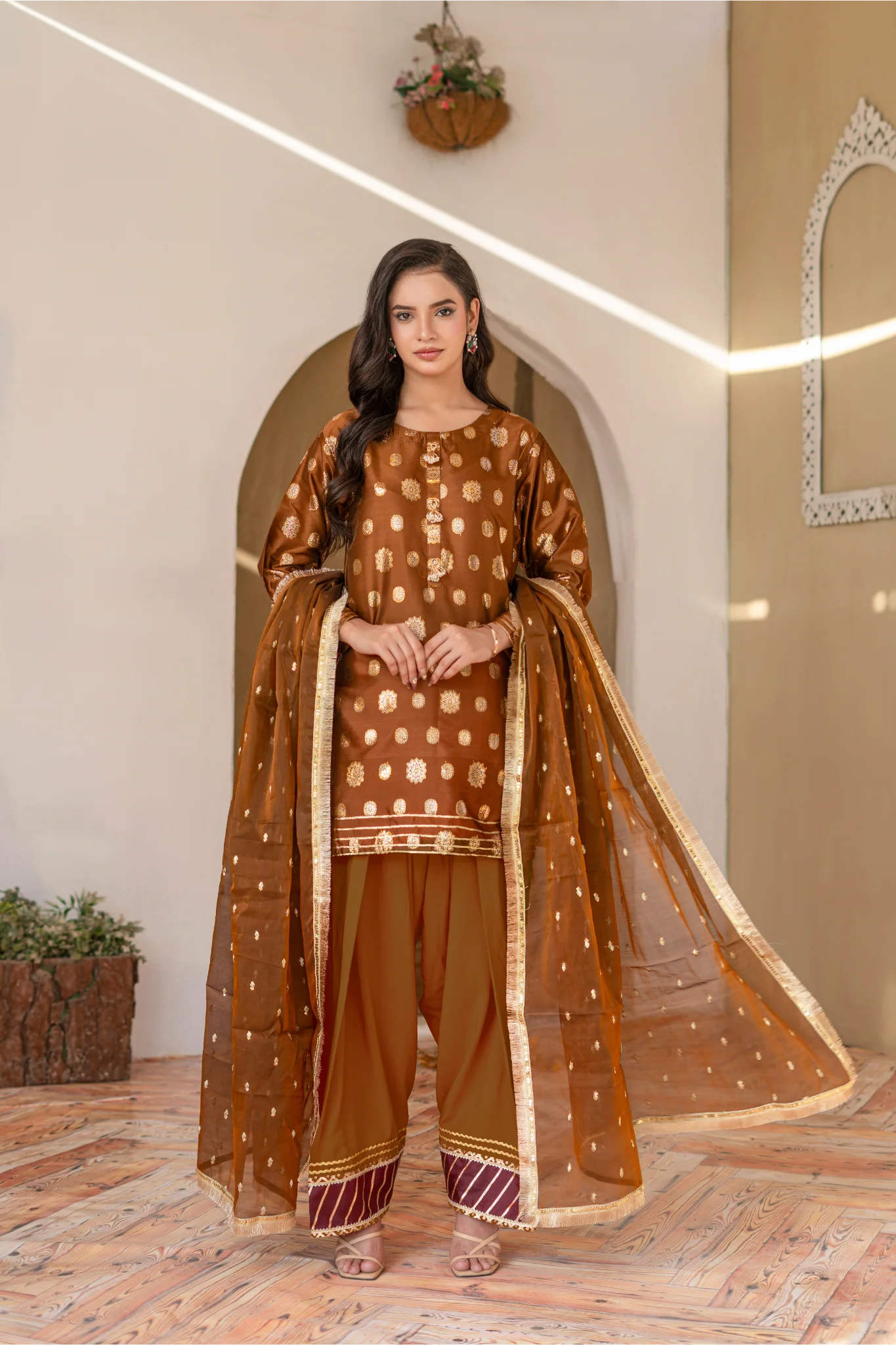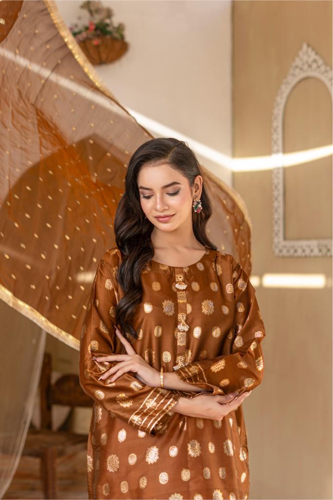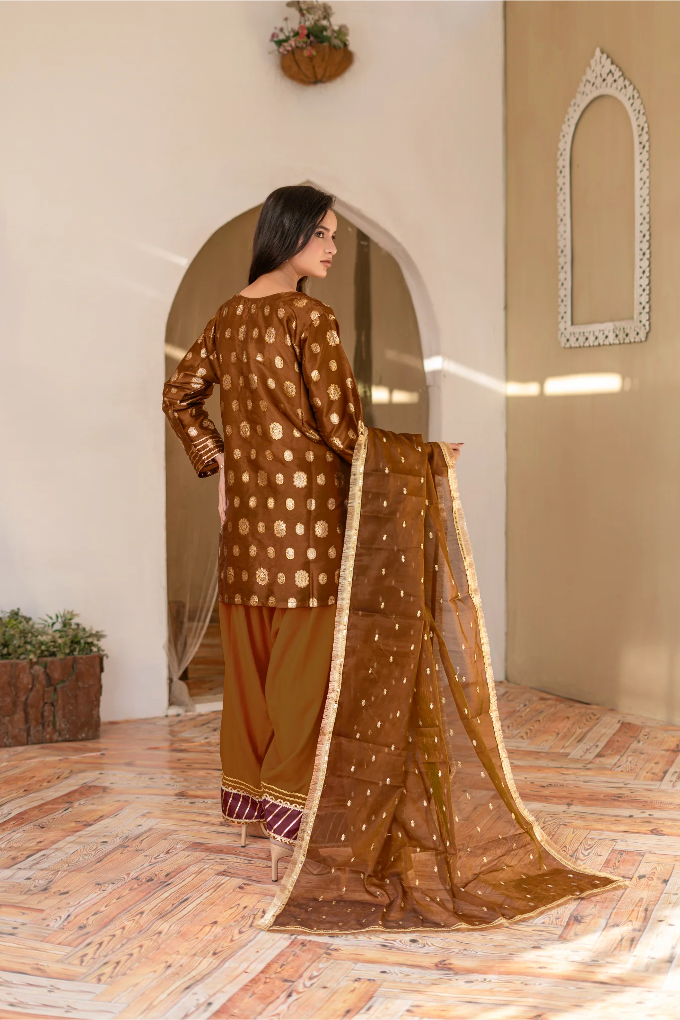 MEHRAAB is a heritage-inspired 3-piece ensemble crafted in a rich metallic brown Banarsi short shirt, reflecting timeless Mughal elegance. The luxurious Banarsi fabric is adorned with traditional woven gold motifs, creating a luminous festive presence.