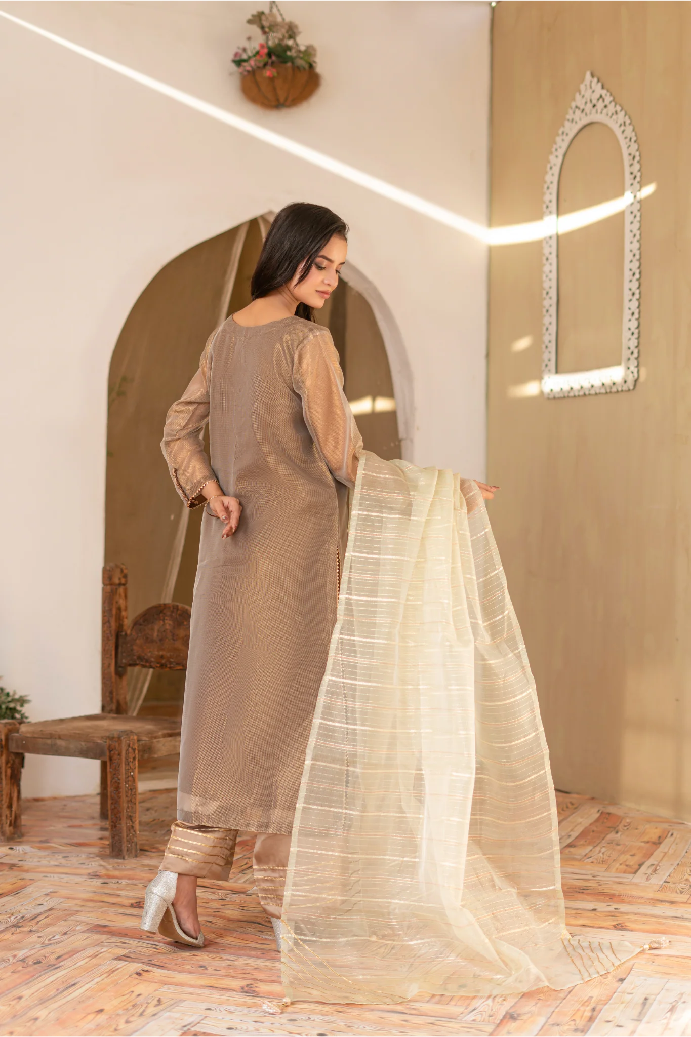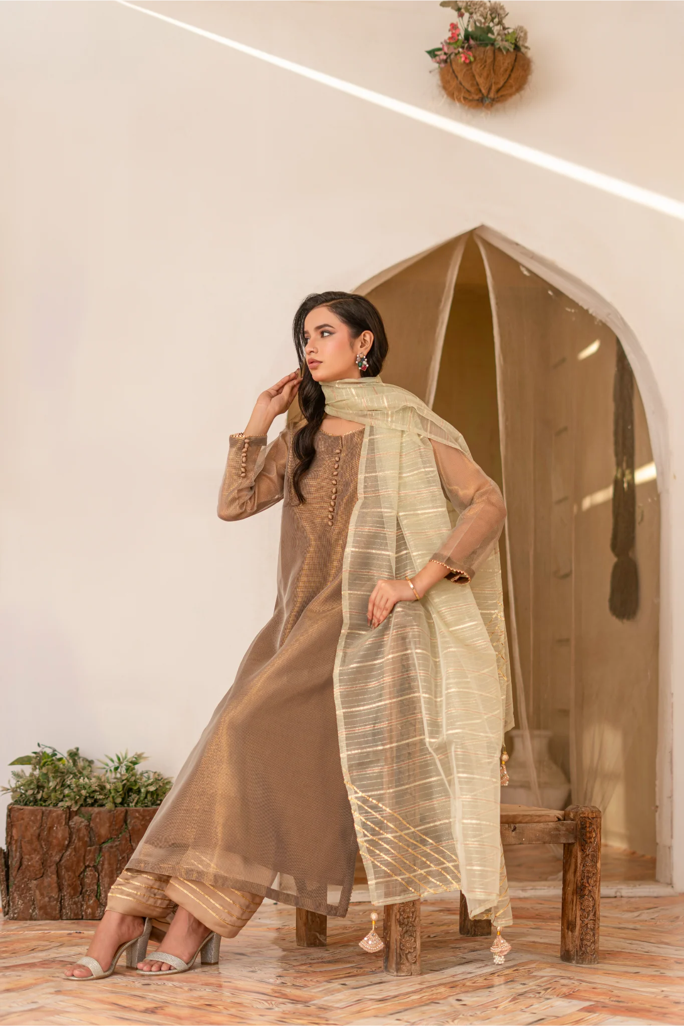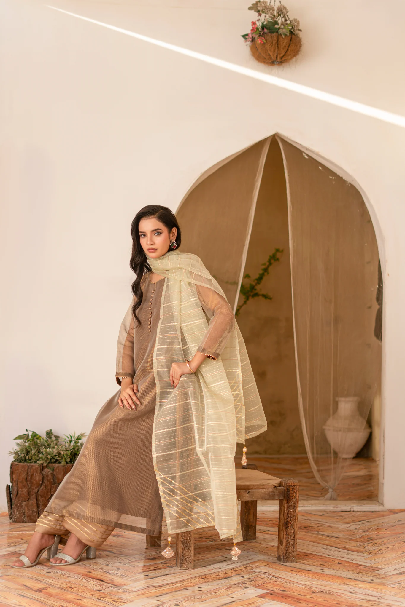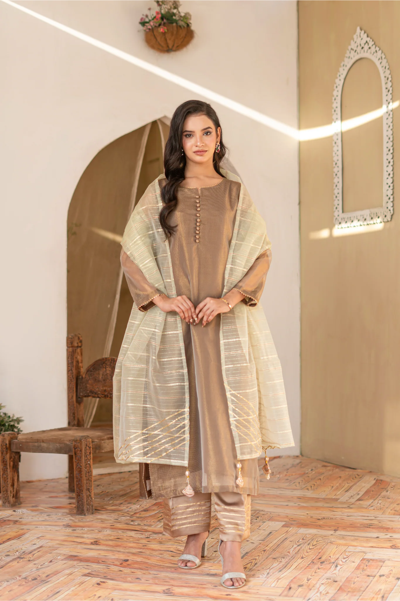 Paired with a fluid shalmoze trouser, adorned with intricate gotta work detailing on the hem, the outfit blends traditional craftsmanship with modern sophistication.