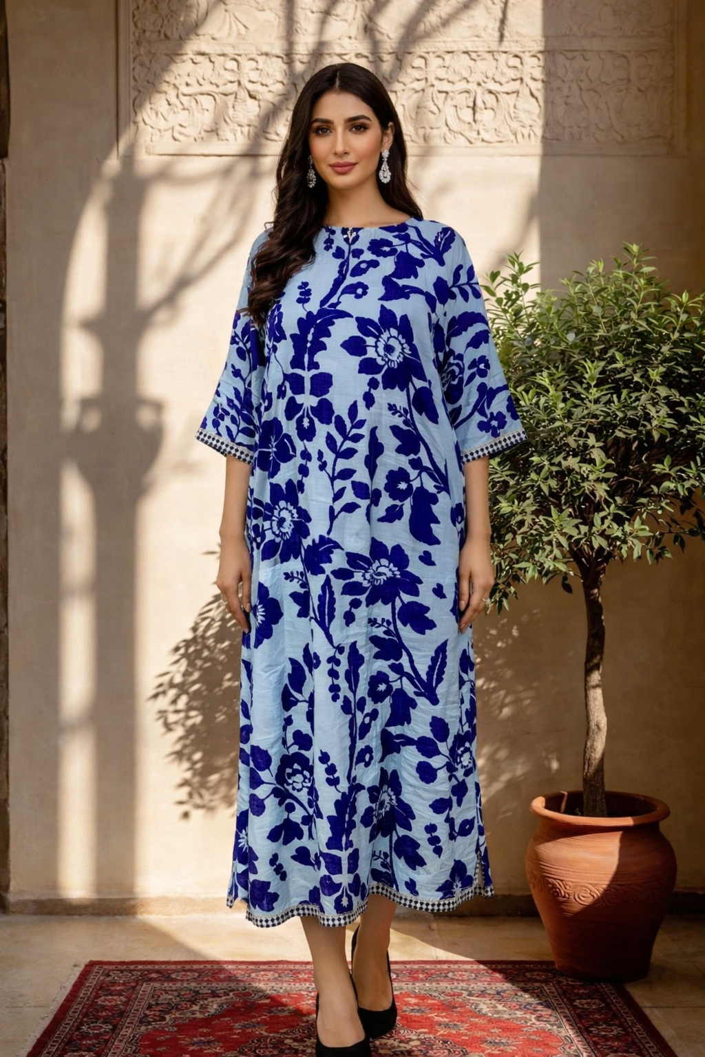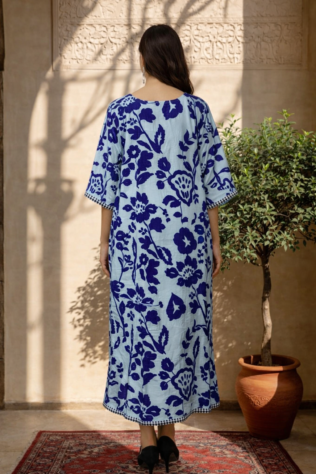 LUNA is a graceful 1-piece kaftan crafted in lightweight poly crepe, designed to offer fluid movement and effortless elegance. Featuring a soft floral print, the silhouette feels airy and refined ??€?perfect for warm evenings and relaxed festive moments.