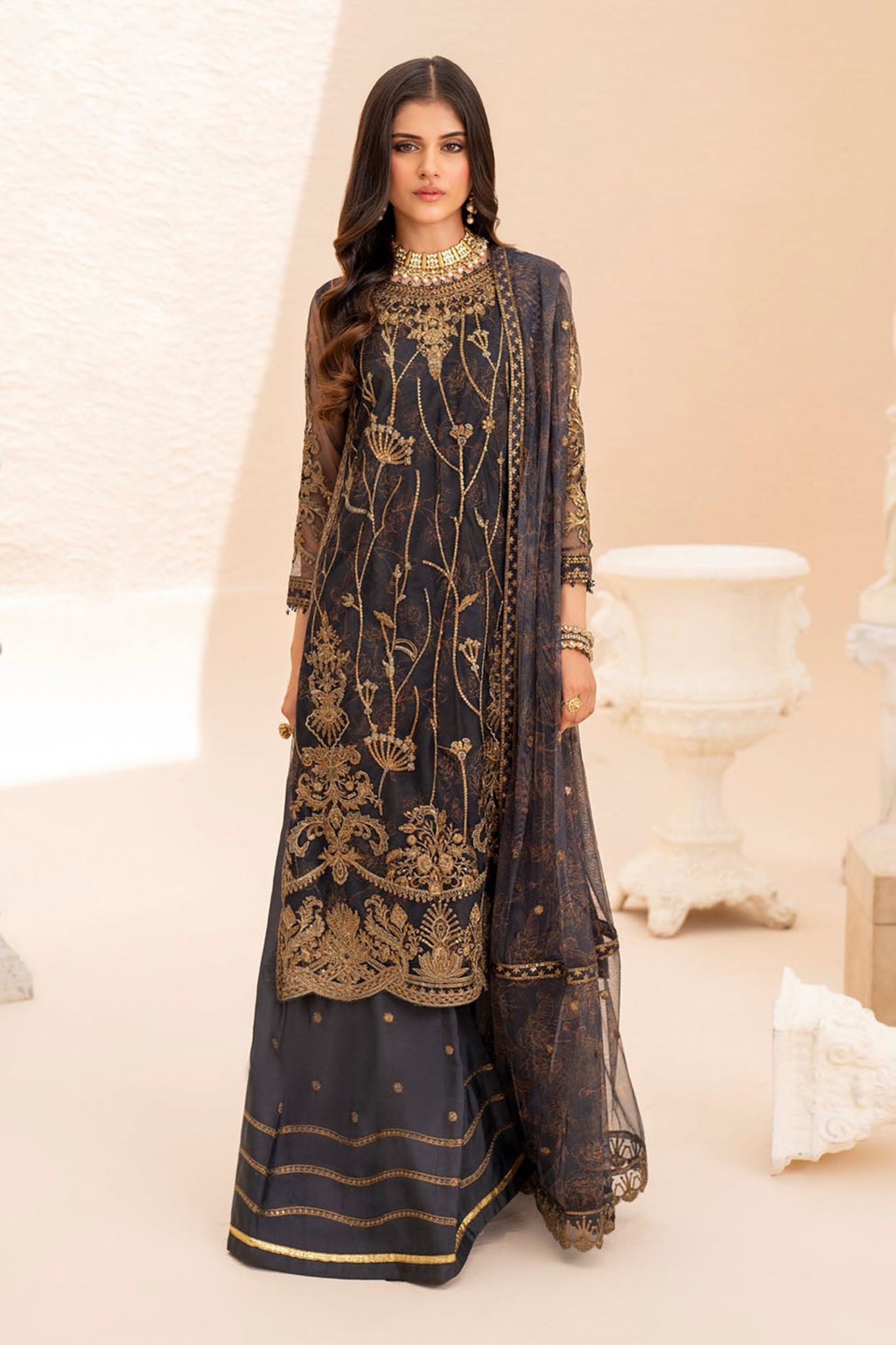 Shirt Front:Sequins Embroidered Printed NetChaak Lace 4 Lines Shirt Back:Sequins Embroidered Printed Net Sleeves:Sequins Embroidered Printed Net Dupatta:Sequins Embroidered Printed...