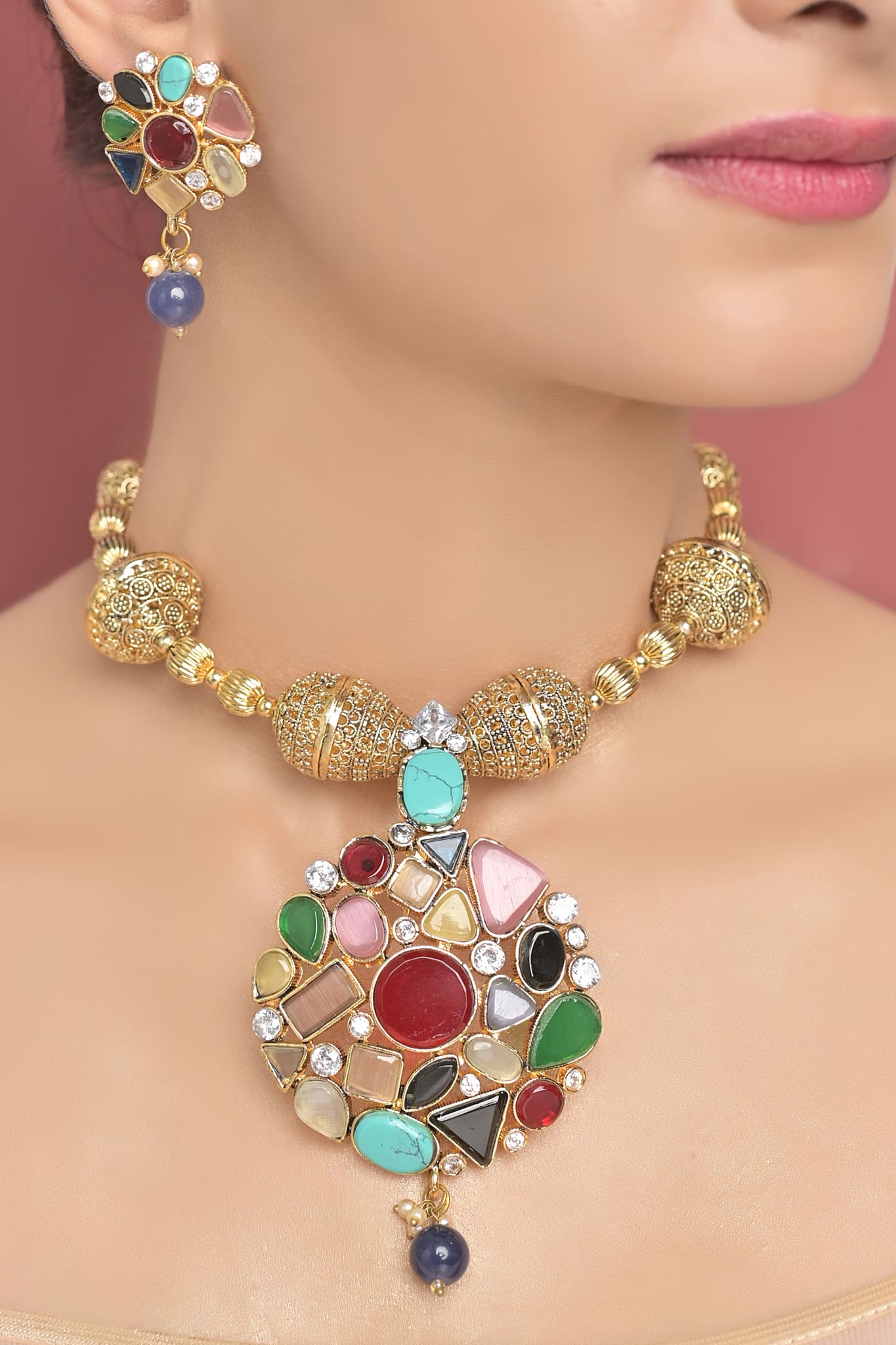 GOLDEN AND MULTI MALA SET STANDARD SIZE MALA WITH EARRINGS MATERIAL MANJUS MADE IN PAKISTAN KEEP AWAY FROM WATER, PERFUME...