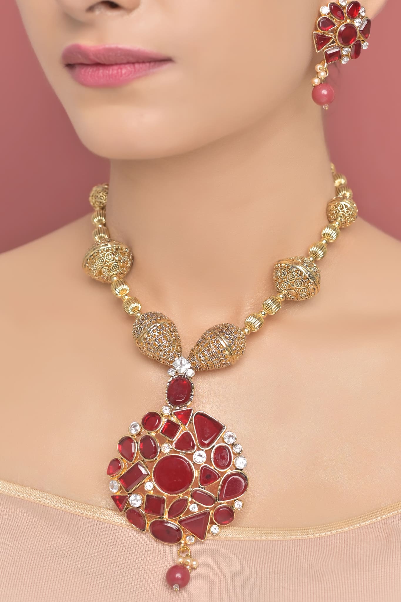 GOLDEN AND RUBY MALA SET STANDARD SIZE MALA WITH EARRINGS MATERIAL MANJUS MADE IN PAKISTAN KEEP AWAY FROM WATER, PERFUME...