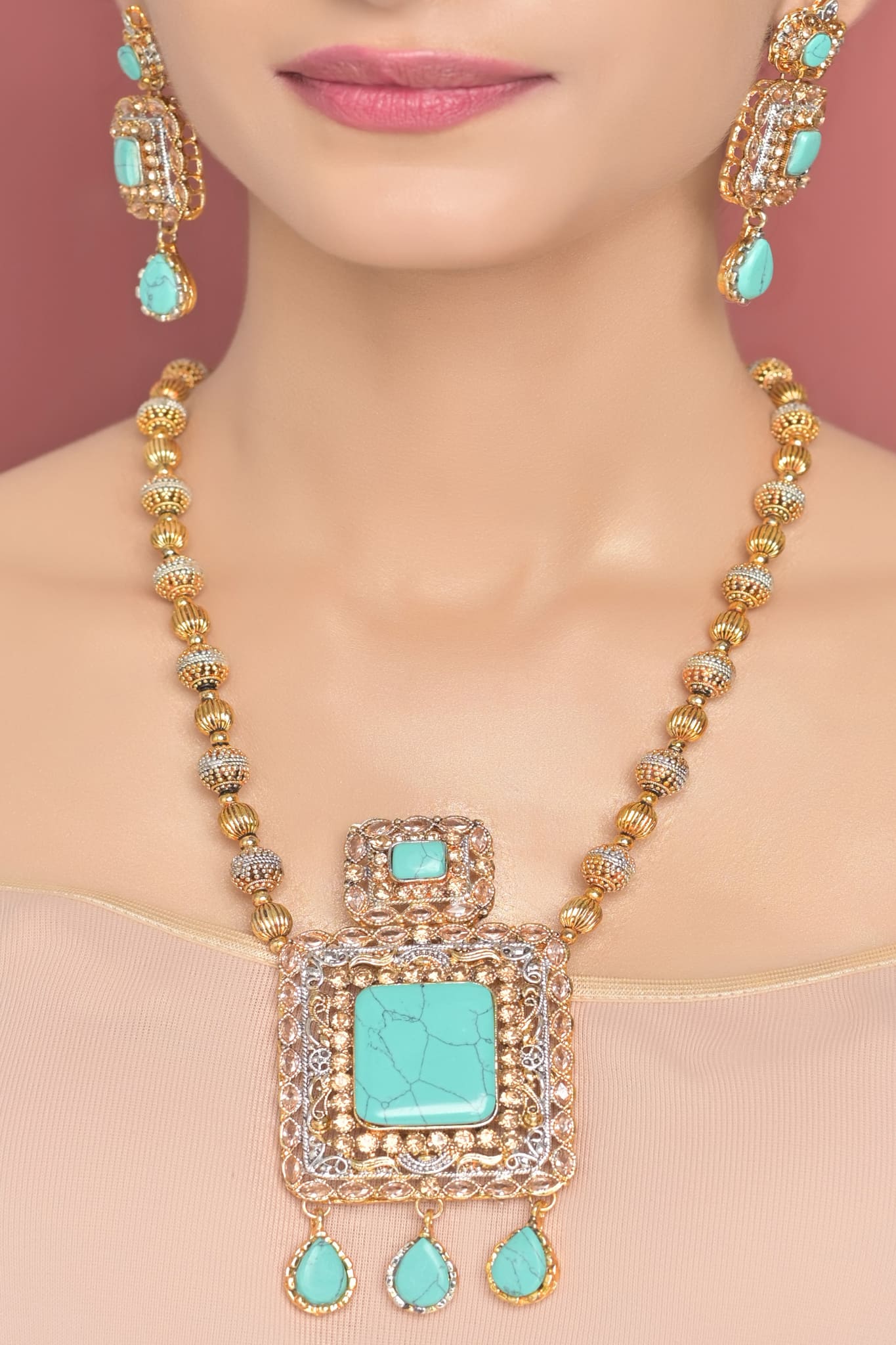 GOLDEN AND FEROZI MALA SET STANDARD SIZE MALA WITH EARRINGS MATERIAL MANJUS MADE IN PAKISTAN KEEP AWAY FROM WATER, PERFUME...